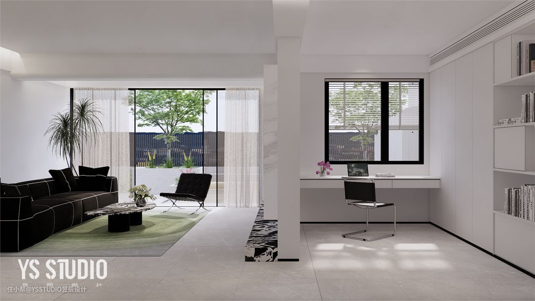 打开客厅旁的次卧,定义为多功能书房,与客厅形成一个可以互动的空间轴。不仅扩展了功能性、层次感,流动的空间也容易增加家人间的幸福感。