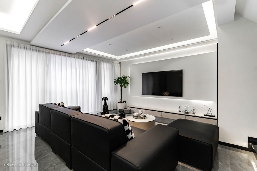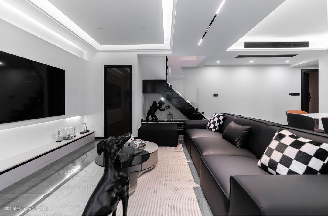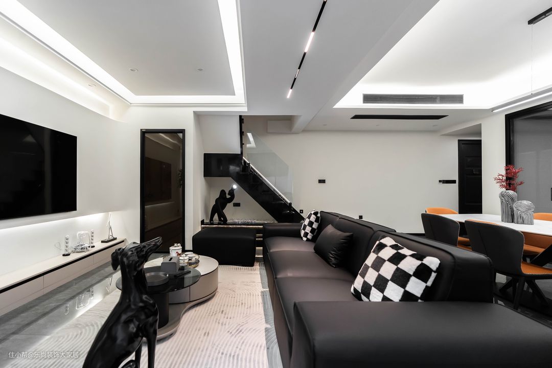 客厅的悬浮吊顶和线性灯带充满了整个客厅区域,满足客厅的极致照明。黑白色系也符合业主沉稳、精致的性格。电视墙设计极简的悬浮电视墙和落地电视柜,尺寸和配色都恰到好处,电视墙也设计了灯带营造氛围感,让黑白色系的大空间也有温馨的体验。