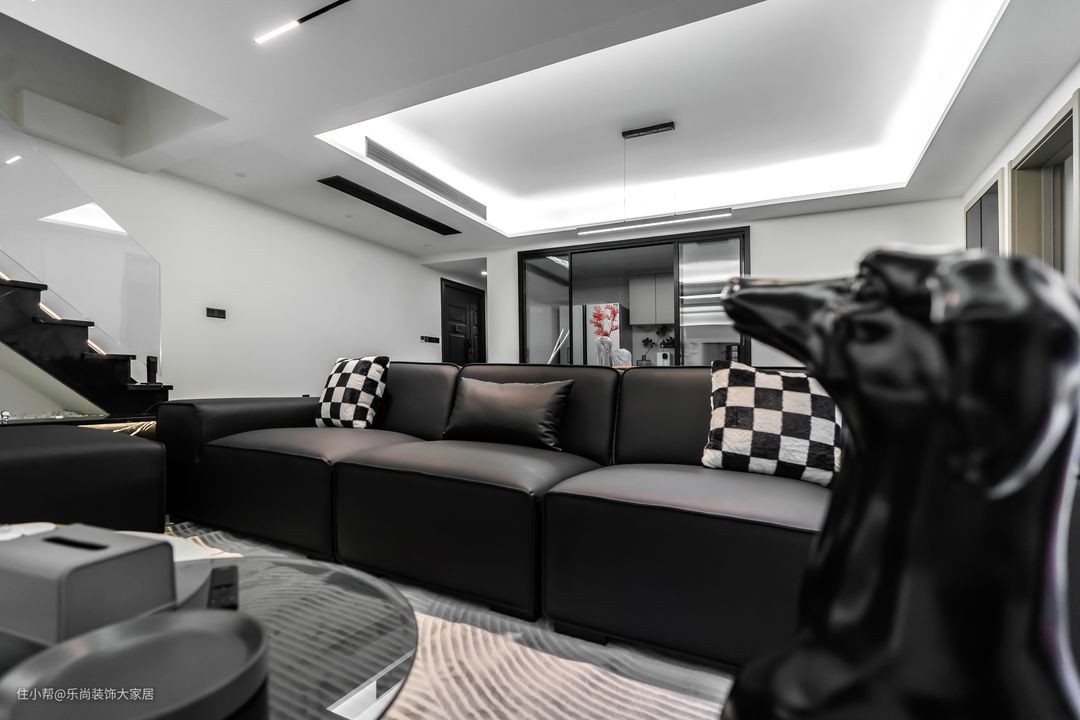 黑色豆腐块的皮质沙发搭配了黑白棋格的抱枕,让纯黑色的沙发也不显沉闷和死板,异性的简约茶几选择了圆弧形更重的设计,巧妙的与直线条做了碰撞和呼应,沉稳不显死板、精致不显俗气,每一处都是满满的细节。