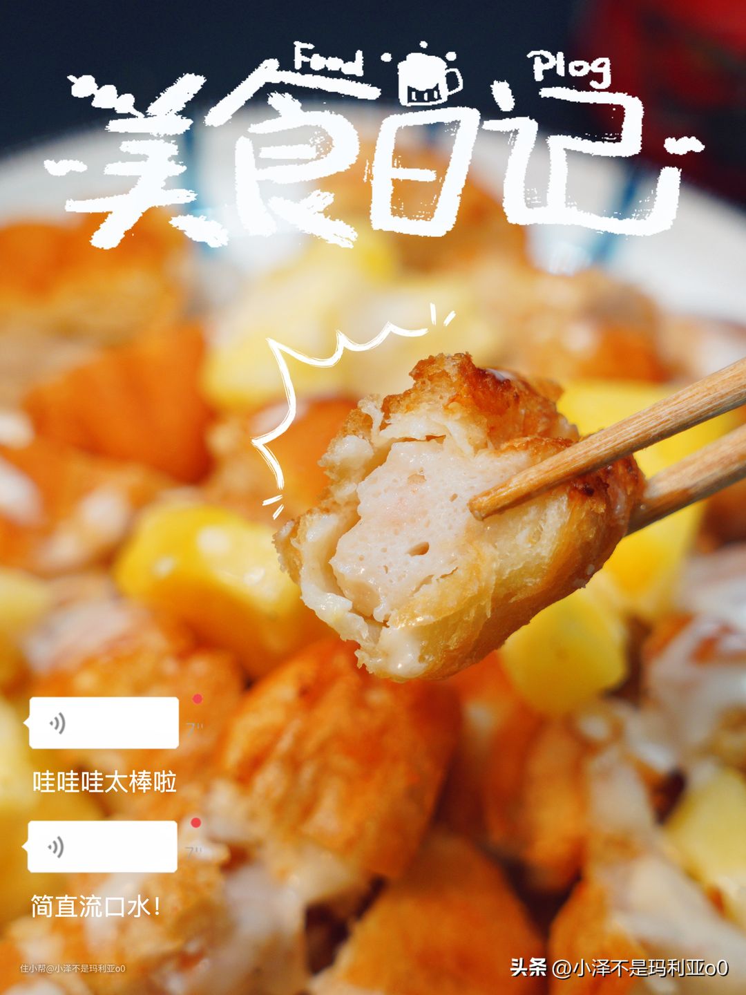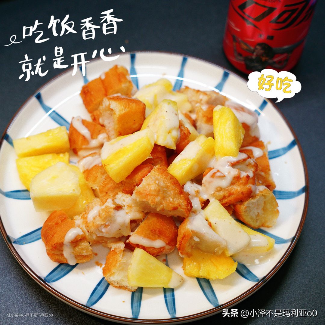 酥脆的油条,中间包裹着Q弹的虾肉,搭配上酸甜的菠萝,口感相当丰富!我宣布,油条虾滑脆列入我的家庭小吃榜NO.1,任何人没吃过我都会伤心,OK?