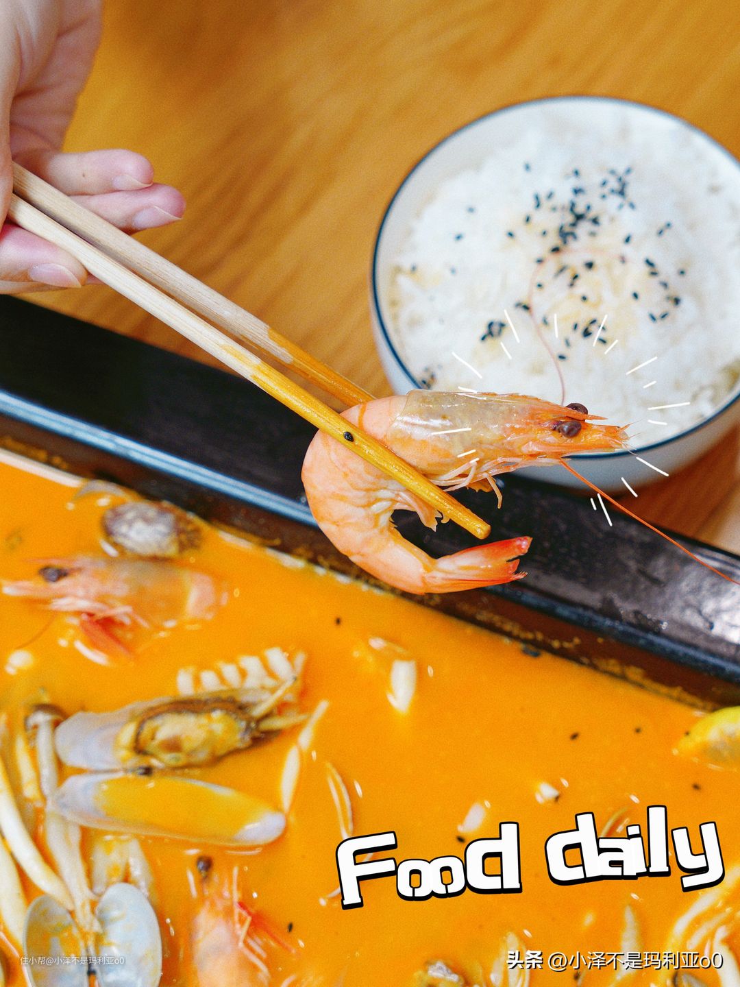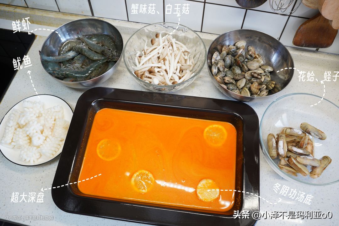 食材就选择自己喜欢的海鲜、大虾、鱿鱼、章鱼、鲍鱼、贝类都可以,还可以再放些菌菇提鲜。