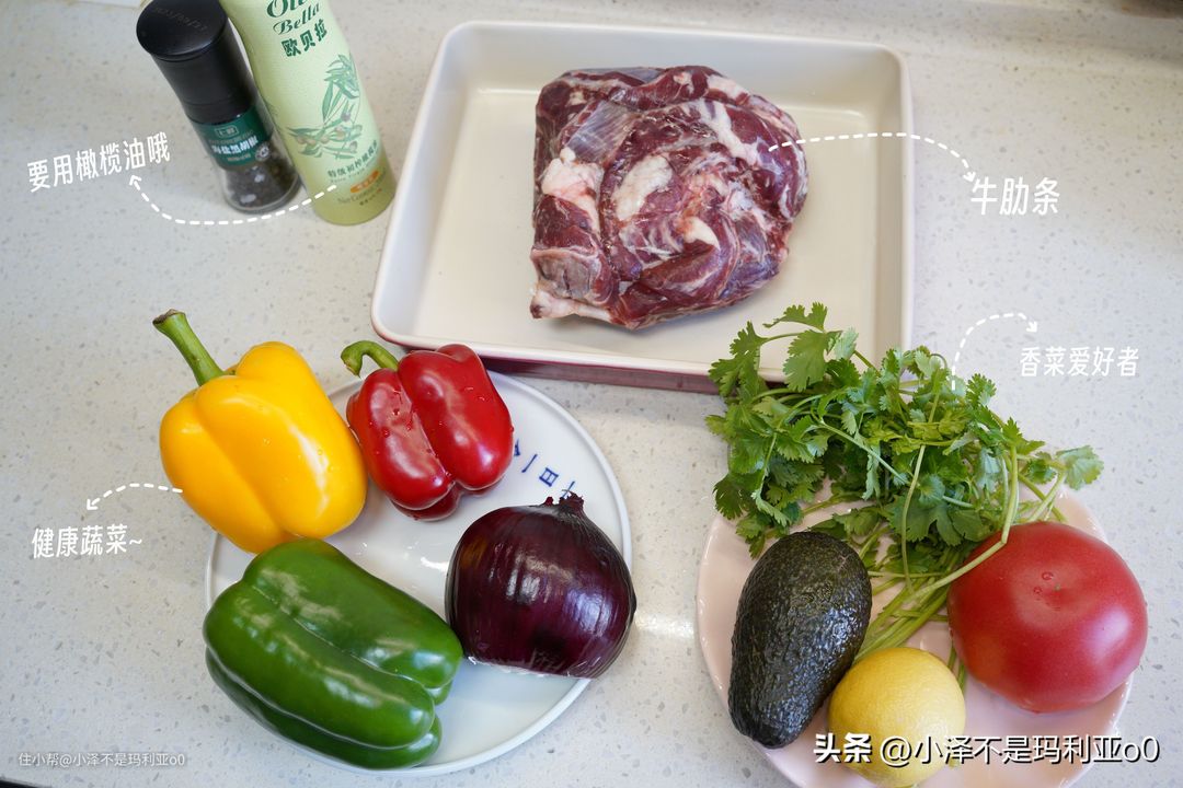 食材需要准备:牛肋条、红、黄甜椒、青椒、洋葱、西红柿、香菜、TABASCO辣椒汁、柠檬、橄榄油、牛油果、酸奶