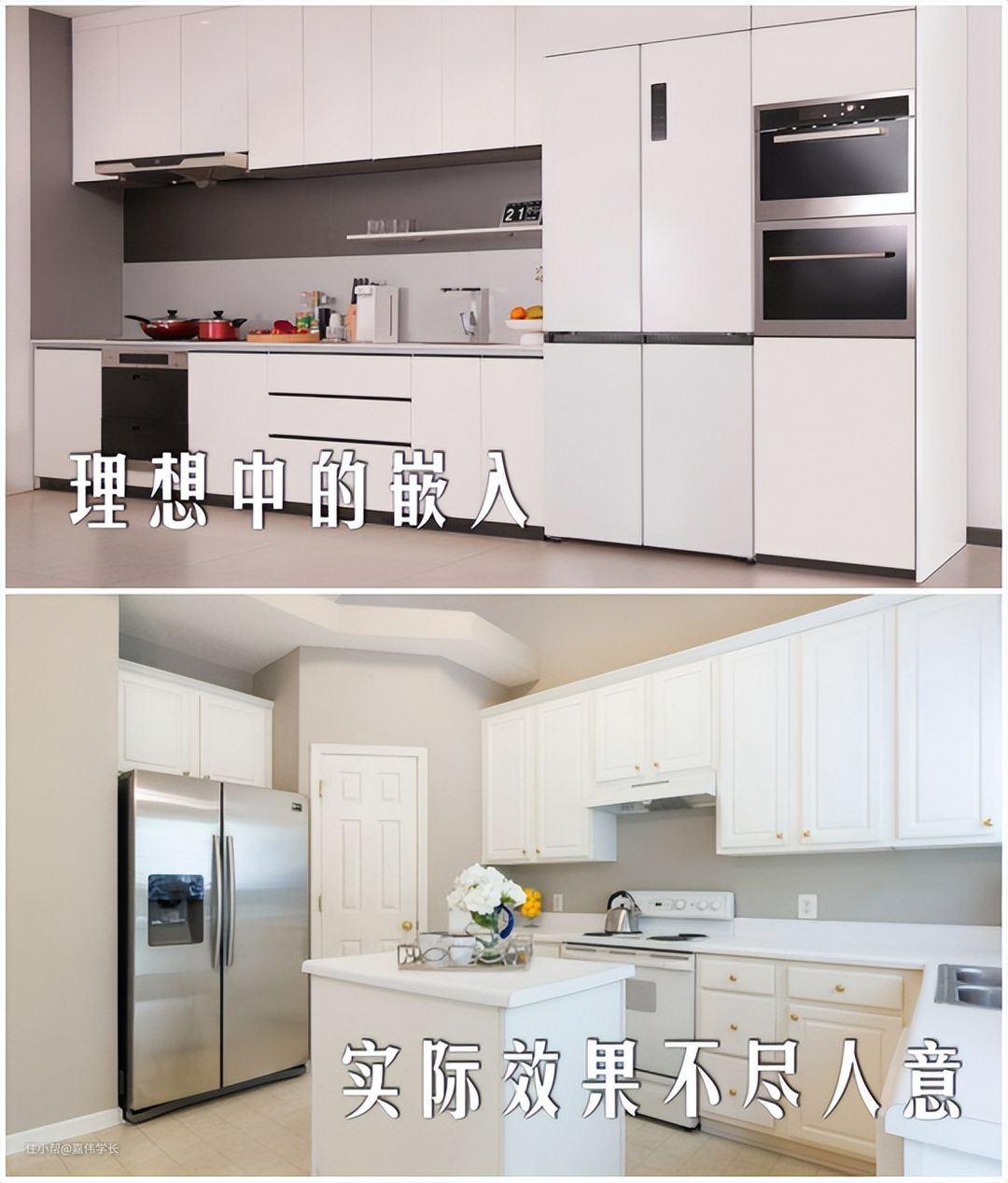 很多人原本希望买到完全嵌入、与厨房整体融为一体的嵌入式冰箱,结果却发现最终得到的冰箱反而更加突出,导致根本达不到理想的嵌入式效果。