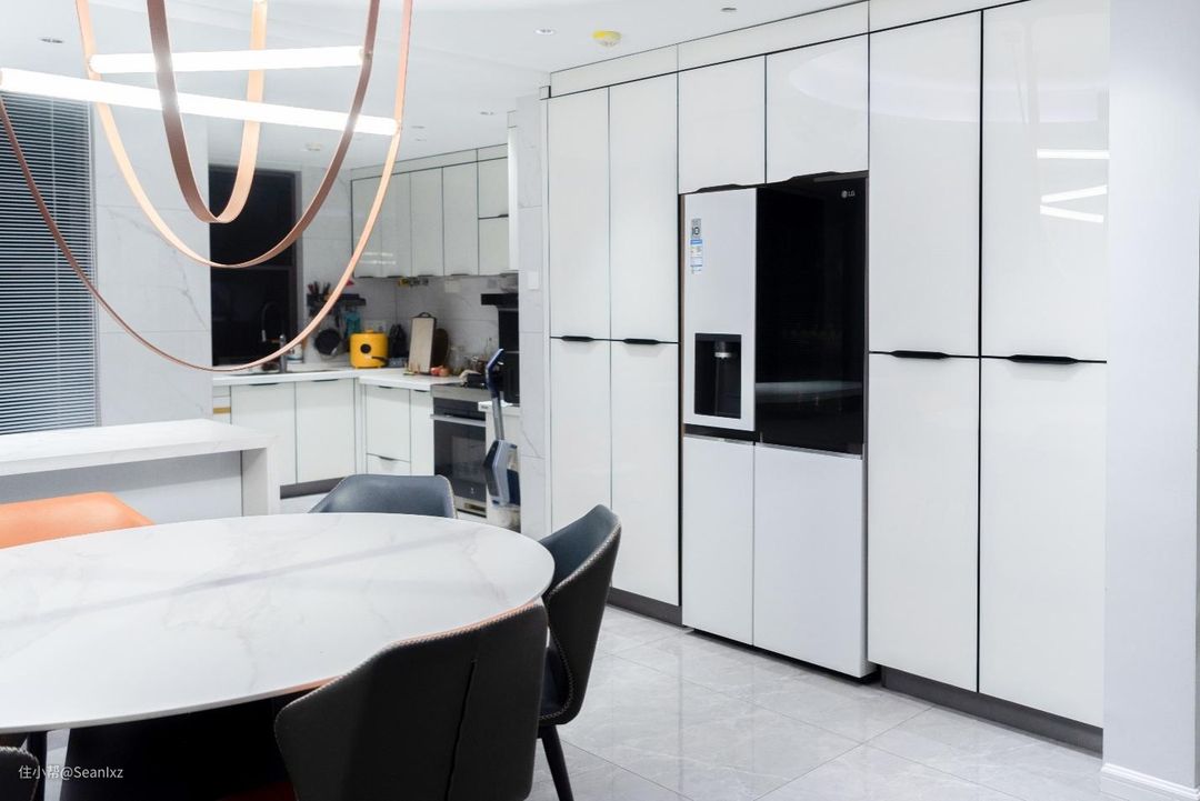 简约的黑白配色也给人十分干净清爽的感觉,棱角分明的线条感衬托出了工业风,外加银色金属质感的门把手线条修饰,科技感满满,一看就是名师之作,我确实没想到这个冰箱的设计能和我两年前梦想的装修风格能走到一块去,真的太爱了,只能说LG的冰箱风格太百搭了。