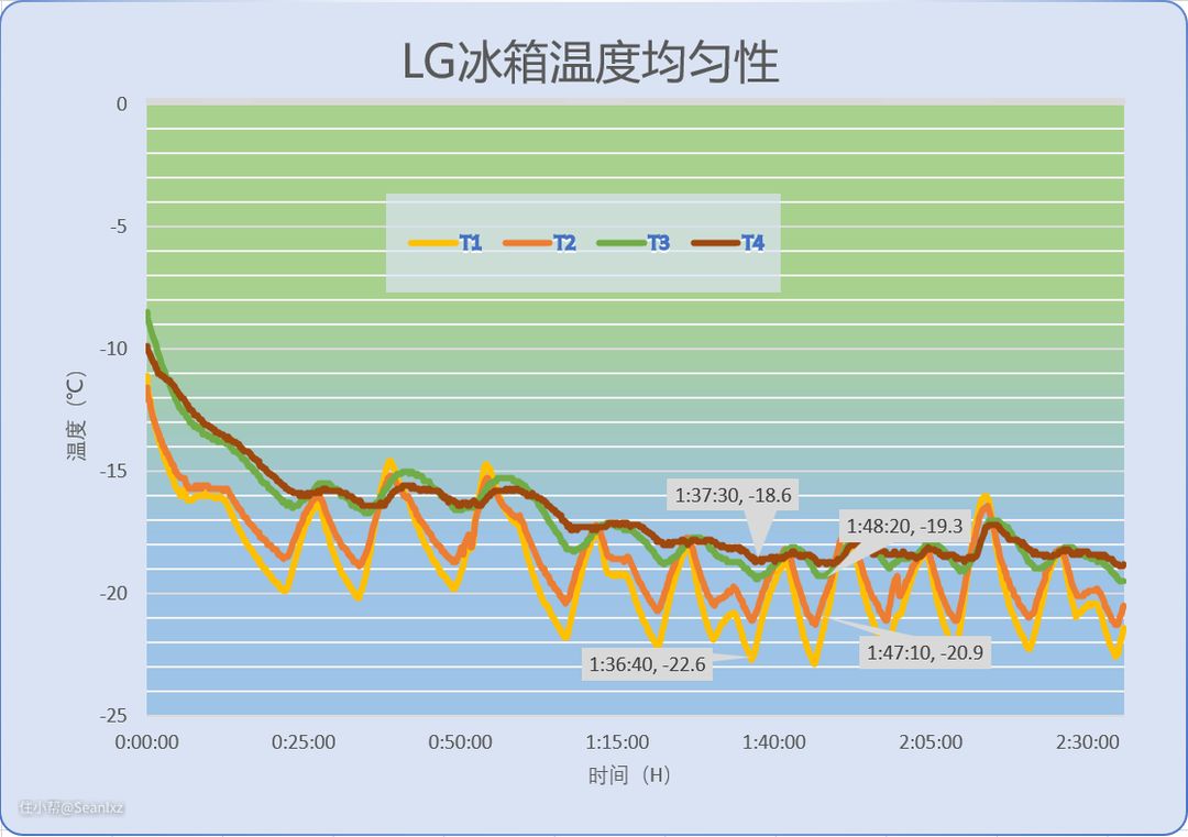 T3、T4是Freezing Zone抽屉内部的温度,看曲线变化应该是没有参与到外部循环中去,抽屉里的出风口在普通模式下默认不开启,应该只有在急冻模式下才会出风,所以变化趋势有些滞后且波动较小,但均达到了-18℃的目标温度,整体温度控制还是不错的。