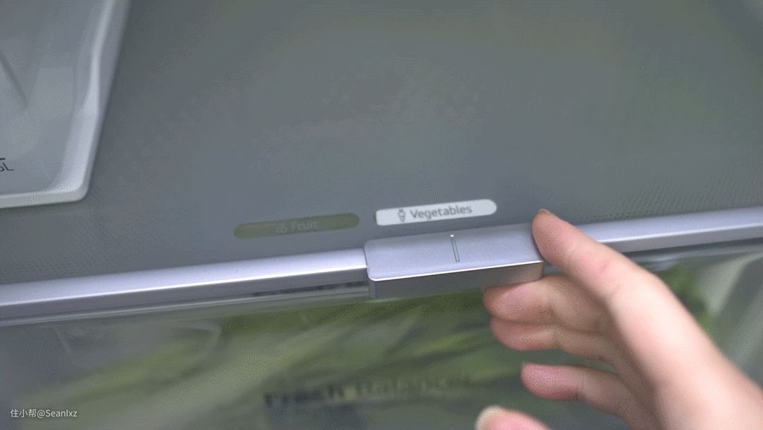这块透视窗玻璃也是LG的敲一敲透视专利设计,功能其实也比较简单,就是轻敲两下可以智能亮起内部照明灯,让用户可以透过玻璃窗看到冷藏室的内容,不用开启柜门查看,减少了频繁开门带来的冷气流失,节能节耗,同时拿取东西的时候也更加有仪式感了,老婆孩子非常喜欢这个设计。
