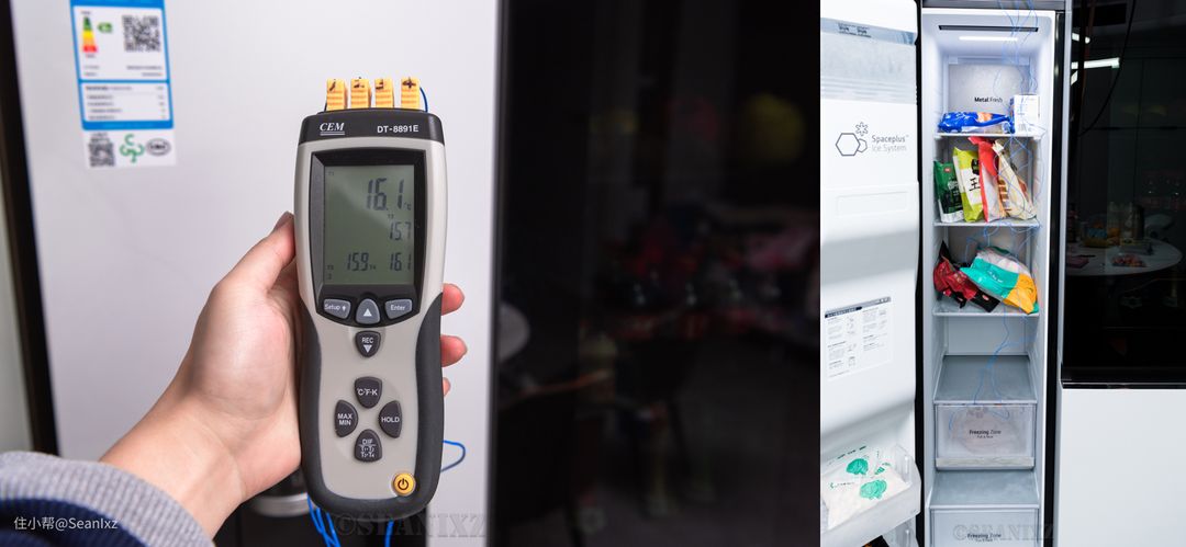 对开门是非常照顾容量的布局,这款冰箱的735mm的深度也在一定程度上增加了容量和空间,不过制冰机会占用冷冻室的部分空间,影响倒不是很大,因为通常来说冰箱的利用率并不是太高,因为日常各类东西是比较杂乱的,上半部分不会塞满到溢出。