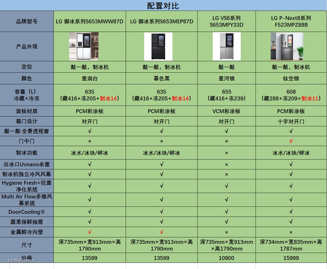 LG冰箱我线上线下都关注过,我主要关注的是敲一敲家族系列里的御冰系列,还有P-Next8系列,LG冰箱其实线下款非常多,而且在线上参数不是很全,关注的几款这里先列表给大家做个参考。