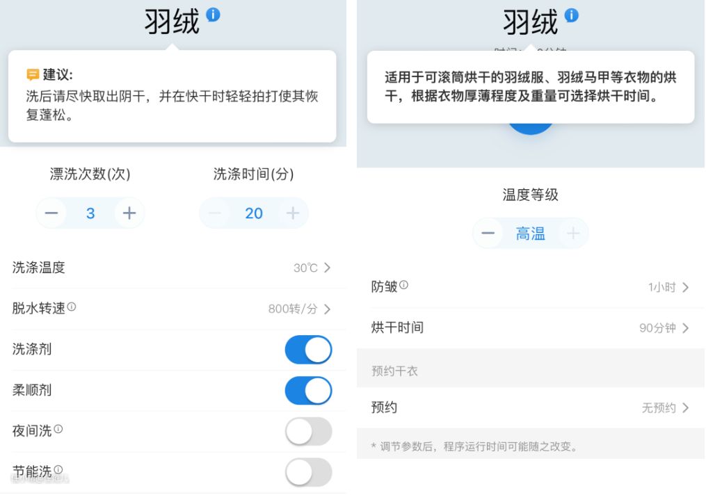 机器洗烘羽绒的参数设置