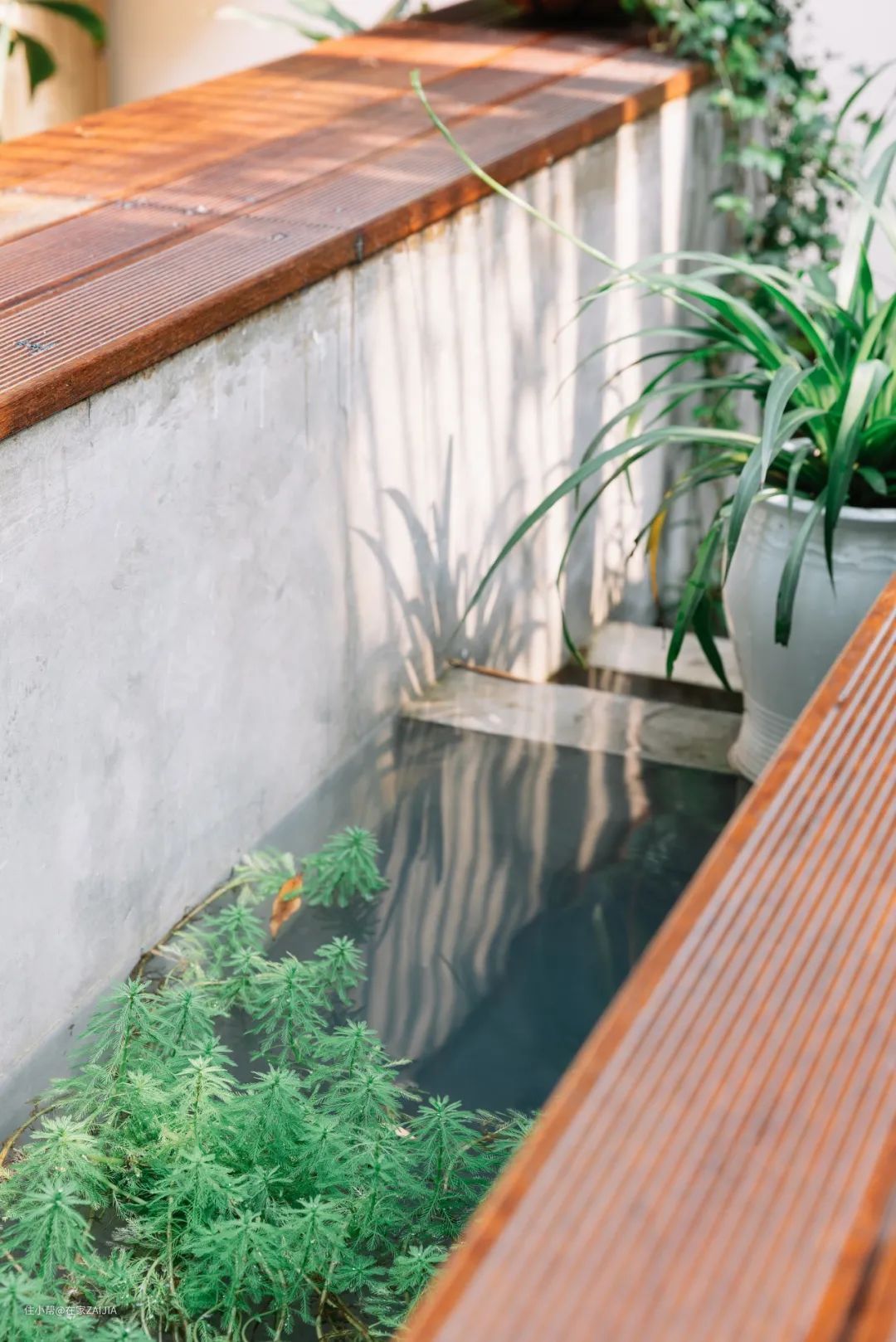 定制的吧台中间是循环的水渠,一直流向负一层天井里的小水池。