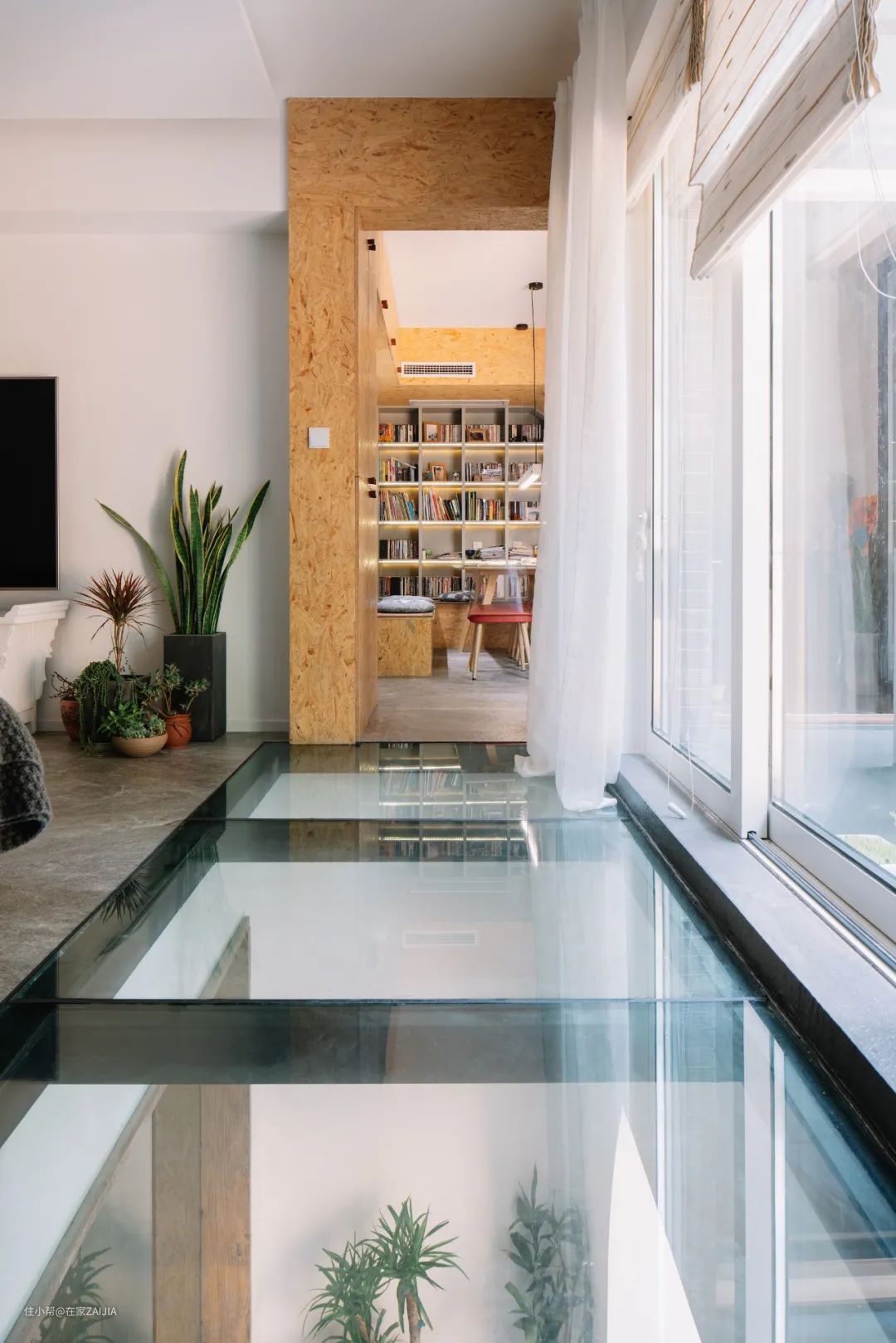 一楼的入户地面将混泥土楼板改成承重结实的采光天窗,同时负一楼的室内空间往后退,楼板改成钢结构的蹦床,为零采光零通风的负二楼提供了斜上方的阳光直射。