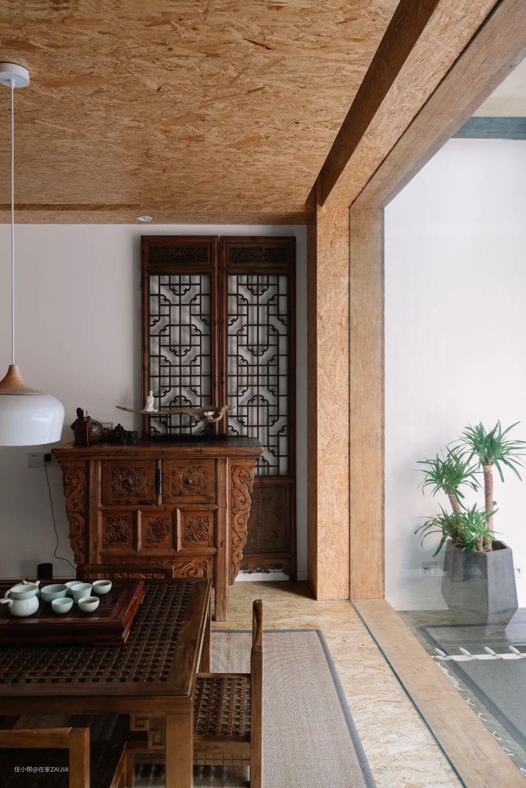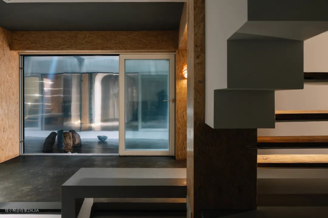 “精神日常”的负一层则用作茶室,设计成地台,整屋运用了大量的欧松板(OSB板),这种材质甲醛含量很少,几乎为零,防水防潮性又非常一流,因为它采用的MDI胶不溶于水,能阻隔水分进入木材中,非常适合潮湿空间。