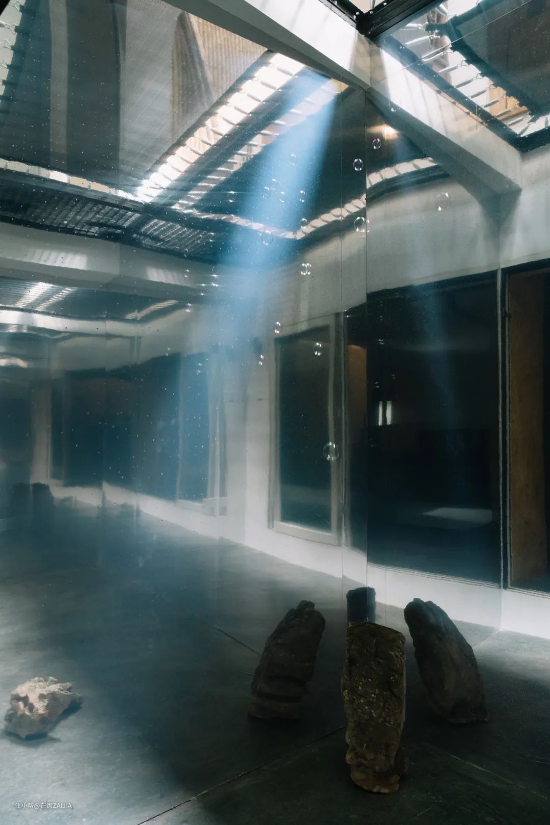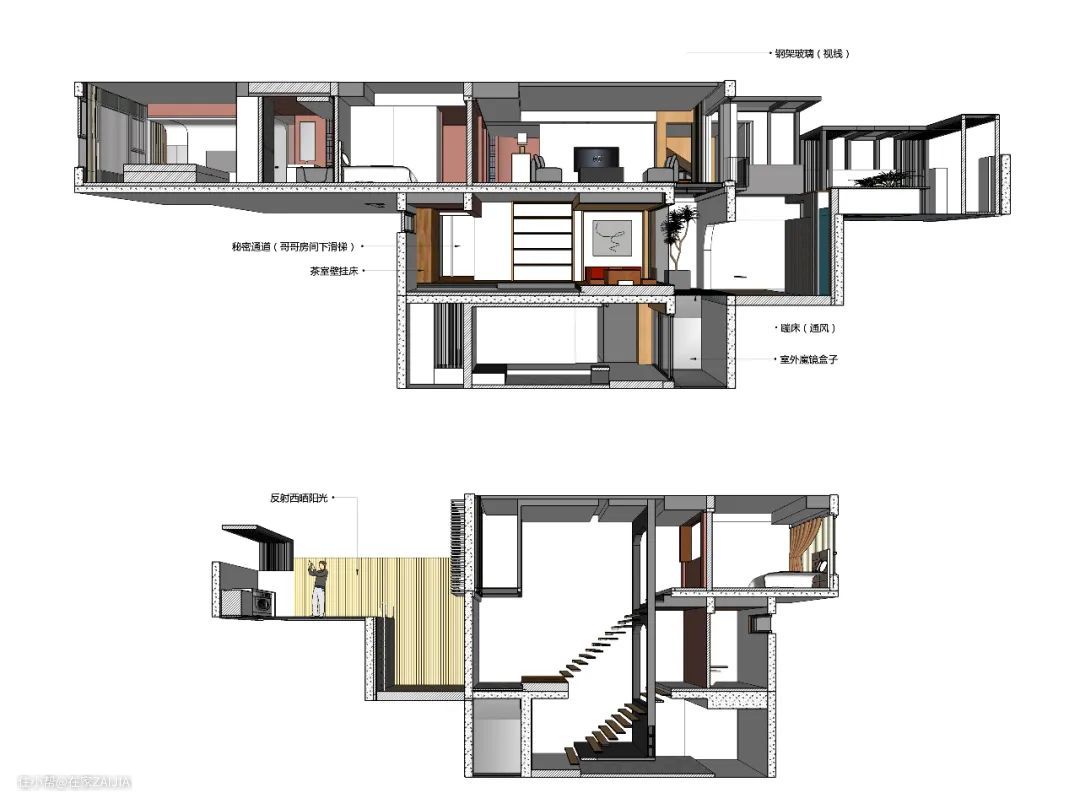 下沉空间和天井则用来展示艺术装置,为J的两个孩子的艺术培养提供了发挥场地。