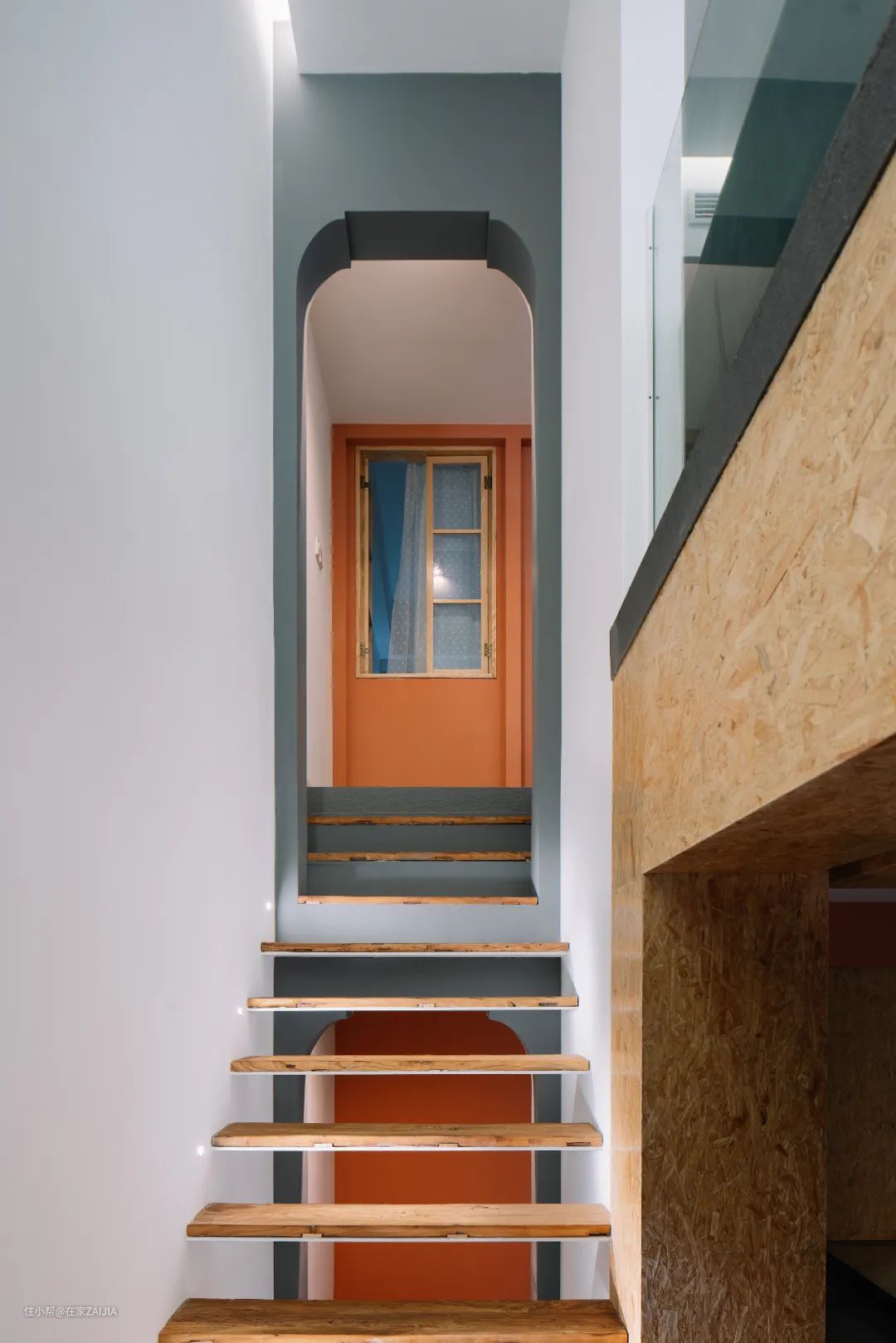 楼梯做了镂空处理,不影响空气流通。门廊的出现贯通三层楼,在心理上起到暗示作用,让长长的单跑楼梯在不知不觉中减少了几梯,不至于那么累。