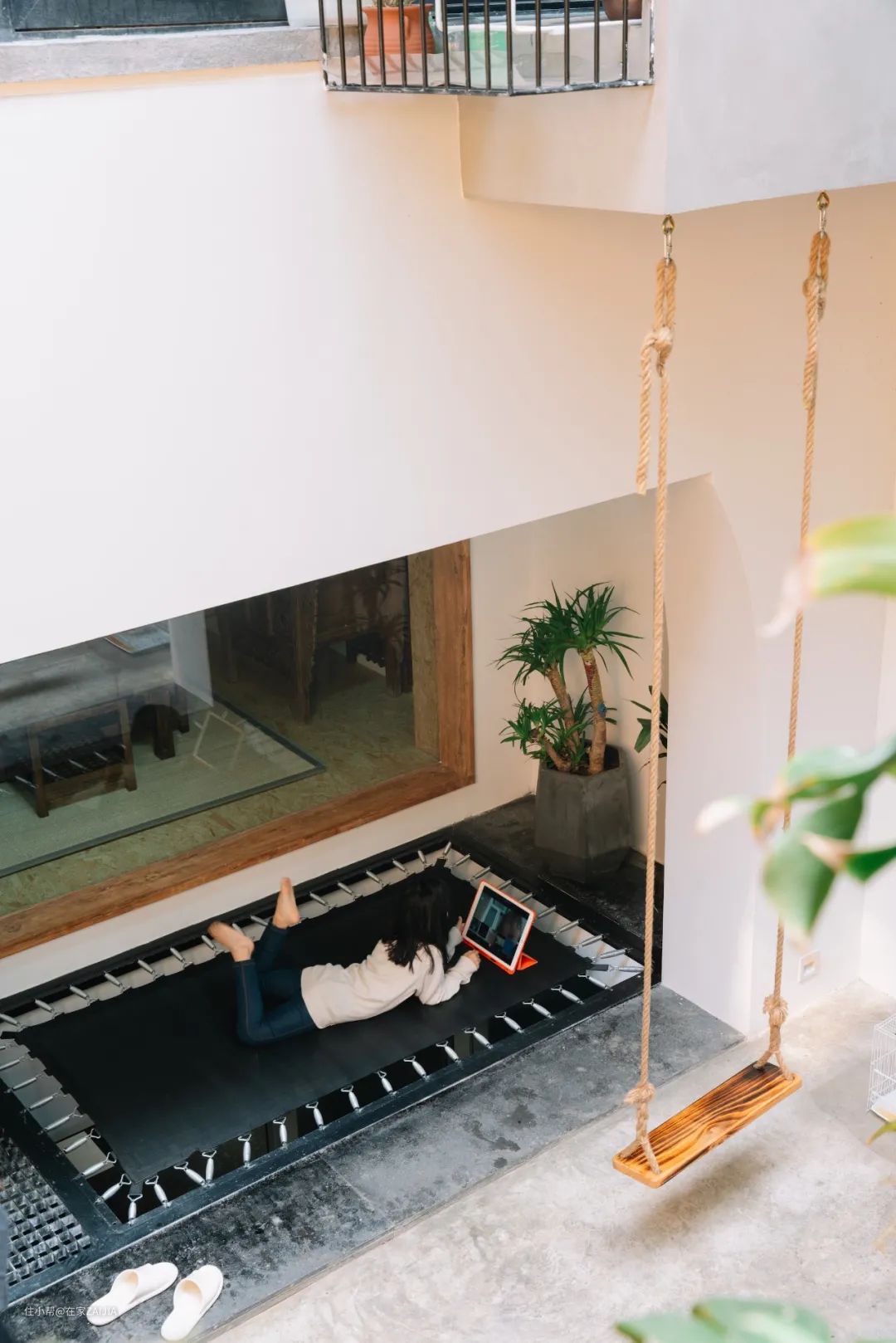 负一层的天井,可以让孩子在家就能亲近自然。蹦床、秋千、水池,让天井变成游乐场,给孩子最有趣的童年。