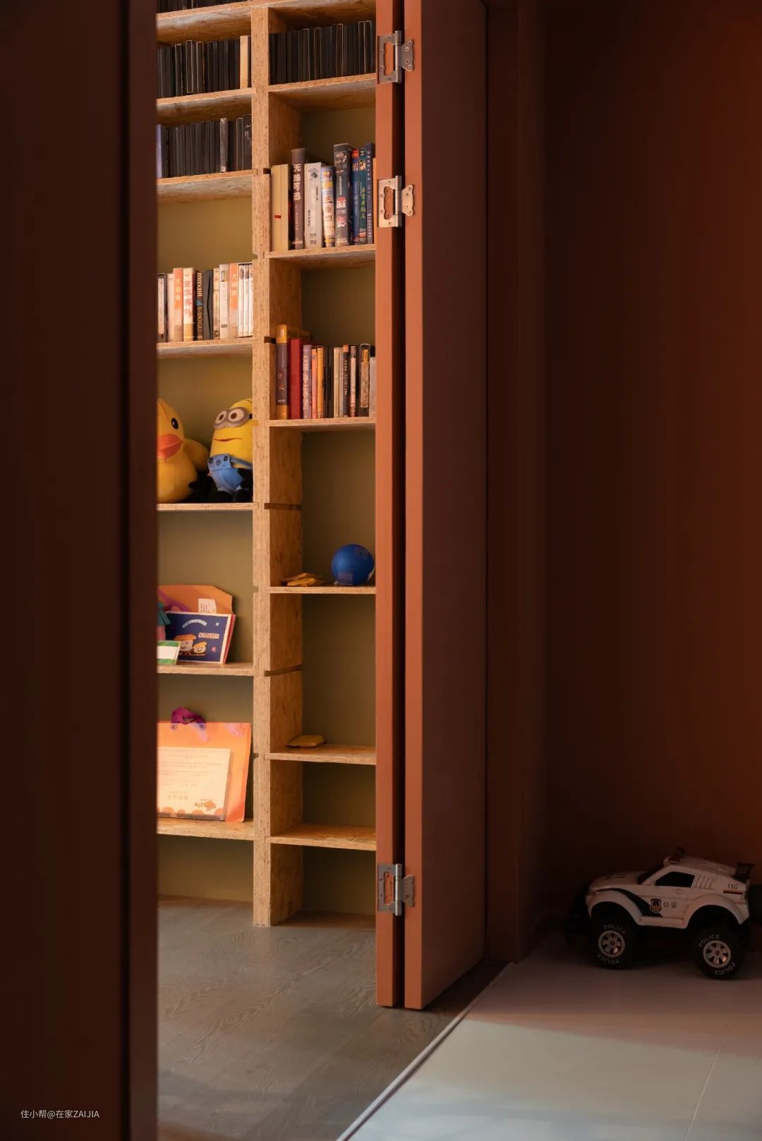 妹妹的房间在过道的转角,里面做了一整墙的欧松板书柜,只刷了清漆,一层底漆,两层面漆。