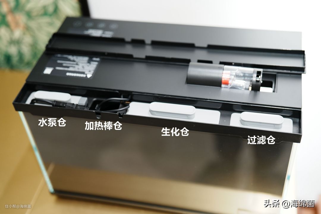 旋转180°看一下背面,这款鱼缸所有的过滤,水泵和线材组件都是藏在后方的,隐藏在黑色背板中,取下后方的舱盖就能看到内部构造。从左到右共有4个舱体,分别是水泵仓,加热棒预留仓,生化仓和过滤仓,模块可以直接往上拔出。