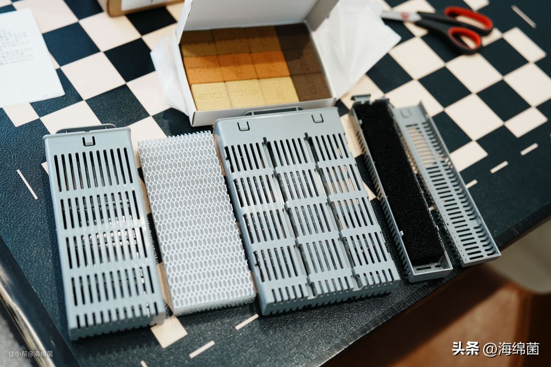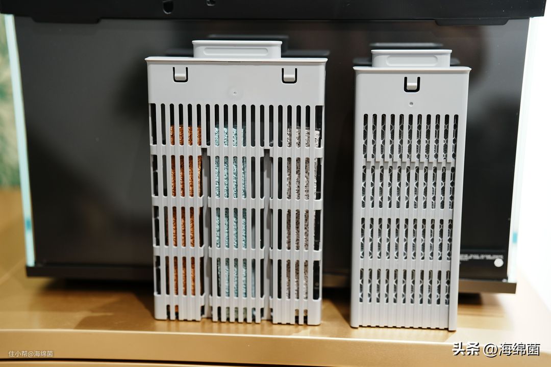 来看下鱼缸自带的原始滤材,左边是生化仓,可以看到有三块类似海绵的东西,是用来培养硝化菌的,右侧则是6D物理过滤棉,原始的滤材盒理论上是不支持打开的,后期可以整个购买更换,网上看到很多暴力拆开更换的教程,有动手能力的可以后期参考拆开。