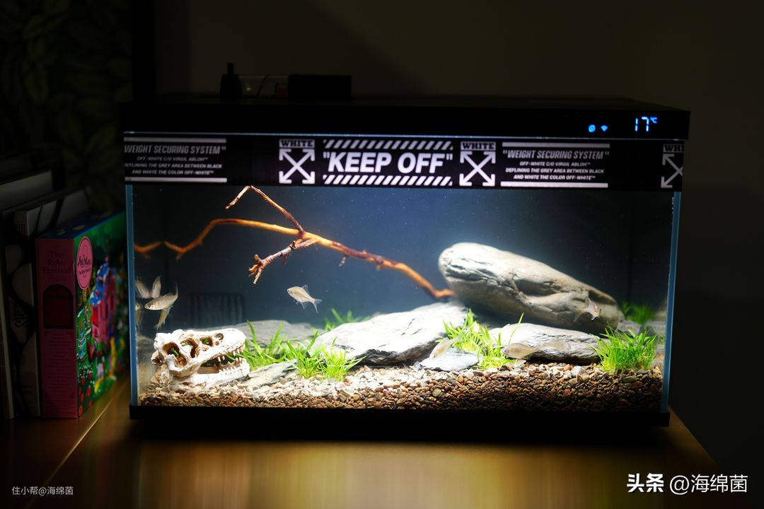 贴纸有各种花色可选,宽度选4cm的刚刚好,贴完后就看不到灯光的反射了,鱼缸整体看起来似乎也更潮了一些~几块钱的贴纸,撕下还不留痕,喜欢就入手,也没什么好纠结的。