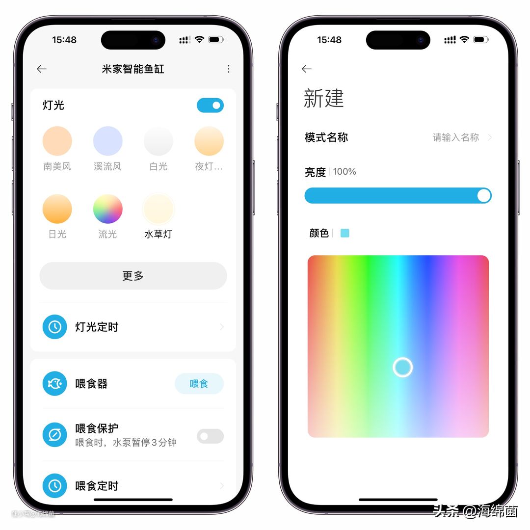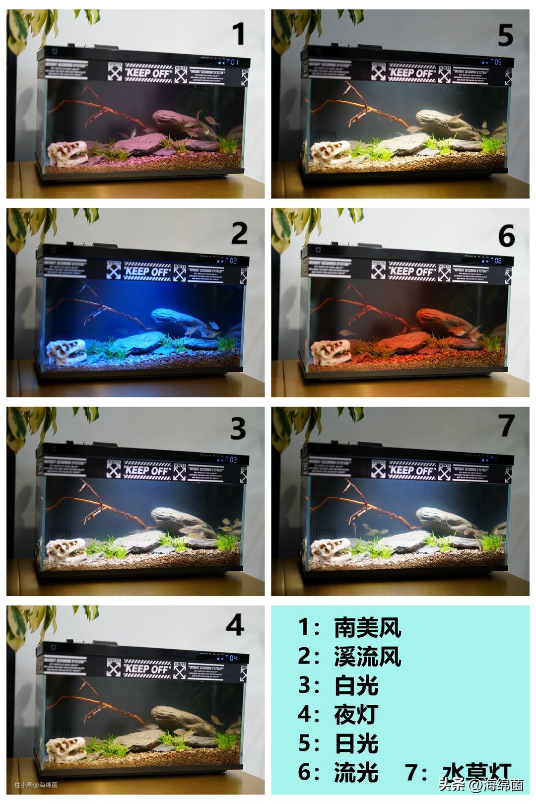 预设光效如下图所示,南美风偏黄,溪流风偏蓝,流光会在不同颜色间转换,水草灯模式下会用优先植物生长的光谱来照射。APP中还能给灯光定时,智能操控体验还是不错的。