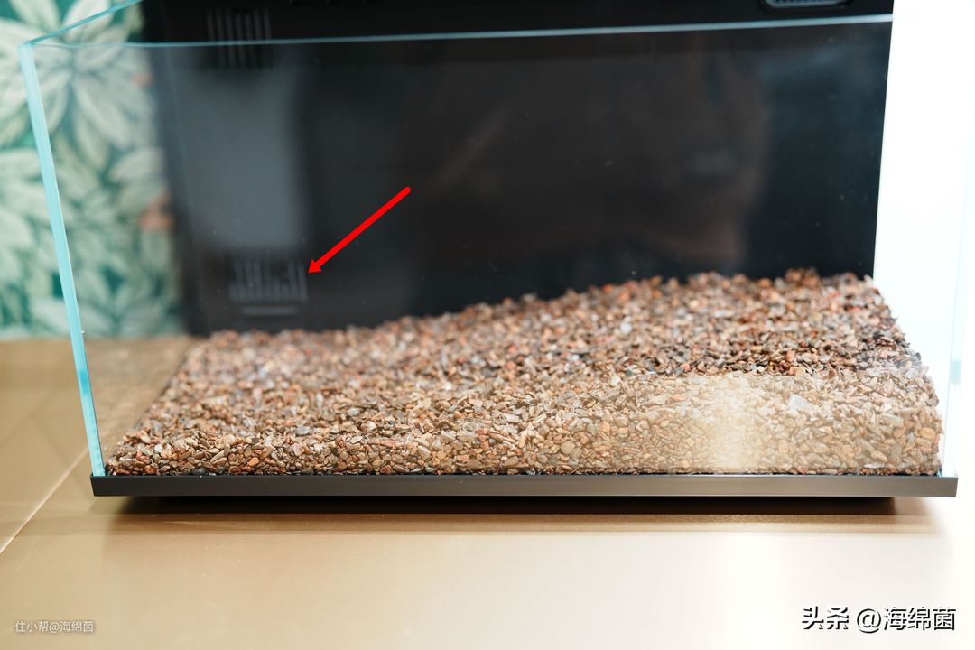 溪流沙入缸之前记得先用清水冲洗一下,5斤的量铺底够用,但感觉多一些会更好,估计6-7斤会更合适,下图红色箭头处是水口,这边底沙要铺低一些避免挡住,右边则可以高一些,有高低落差看起来也会更自然。