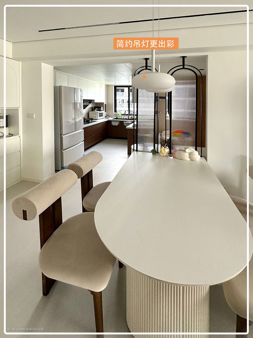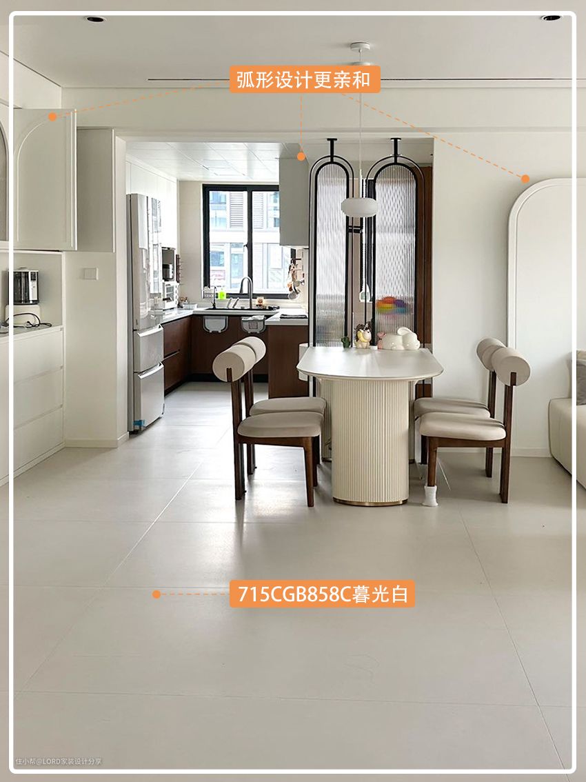 ️沙发背景墙的弧度设计,柜子与隔断之间的户型造型或者材质的选择,以及浅色系户型设计的餐桌,弧形元素将空间填满,整体设计更显柔和与温馨。