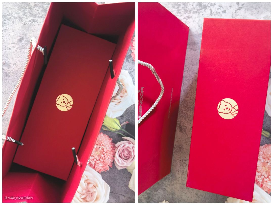 手提袋和礼品盒是我喜欢的红色。设计很简洁,中间只有烫金的logo和商标。