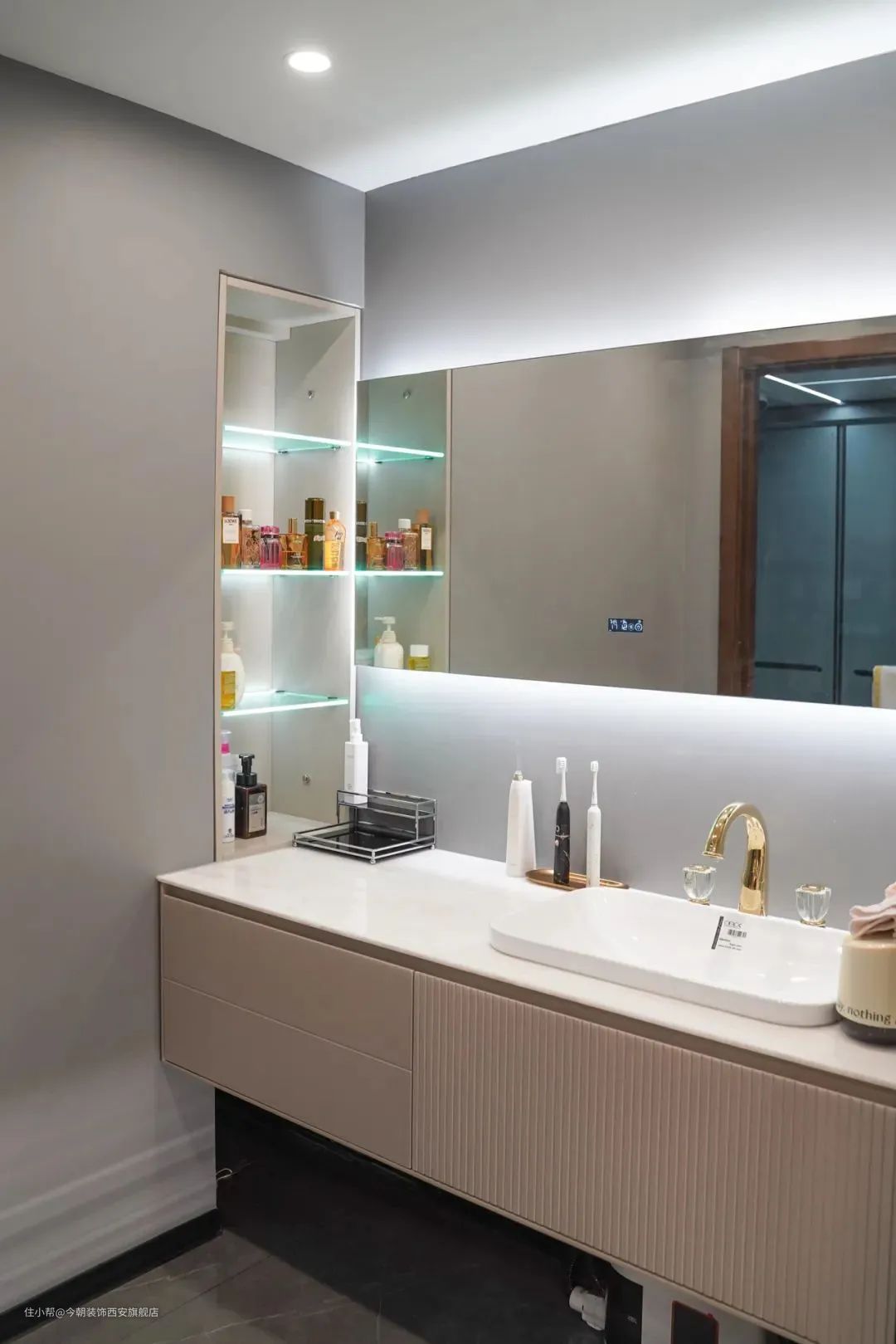 卫浴柜悬浮,并且下水管改成墙排。卫浴柜底部是悬空的,拖地,扫地或者用扫地机器人,都很方便。