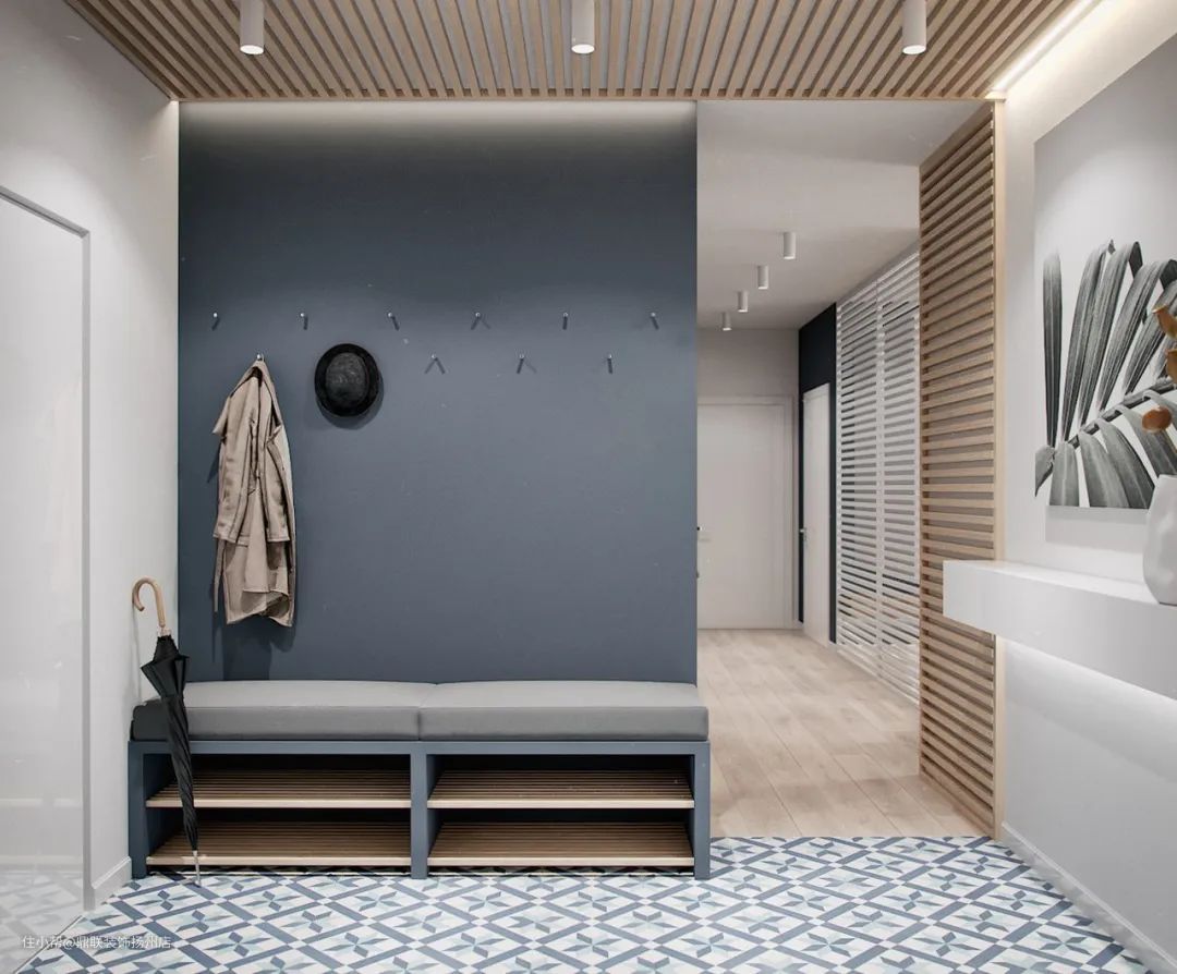 空间允许的话,用顶天立地的柜子作为隔断非常合适,不仅能分隔空间,也大大的增加收纳,进门的鞋子,衣服再也不愁没地方放了。
