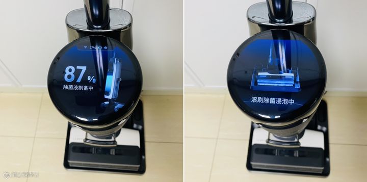 最后,还会启动离心风干工序,利用风力来加速水分蒸发,让滚刷快速变干燥。变干燥的好处不言而喻,就是减少细菌和霉斑滋生。这个风干过程还是常温不加热的,避免细菌扩散,保护家里的健康环境。 整套自清洁流程完成后,滚刷干净干燥,我用纸巾做了测试,确实没有什么残留。