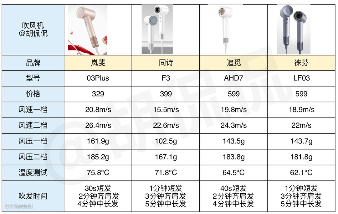 虽然岚斐、同诗、追觅这三款主打的功能都是护发,但别忘了它们也是高速吹风机。吹风机吹发效率是核心指标, 吹干速度快不快, 主要看风速、风压、温控三大方面去看。 这三个方面是如何影响吹发效率?