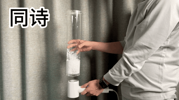 测试方法:在相同室内环境和相同时间下,首先将泡沫管上下摇晃几次使管道充满静电,然后将吹风机出风口对准管道上下分别吹5秒,最后查看不同吹风机对于泡沫球上的去除静电效果如何?