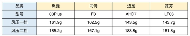 在开一档的时候, 岚斐是161.9g, 同诗是102.5g, 追觅是143.5g, 徕芬是143.8g。