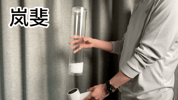 开始测试前柱子内的泡沫球充满了静电, 大部分球体都附着在内壁上面。 接下来我用四款吹风机分别对着柱子内吹风, 看看它们各自的消除静电的效果。