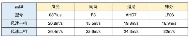风速测试结果可以看到,岚斐是26.4m/s, 追觅是25.4m/s, 同诗是22.6m/s, 徕芬是22m/s。