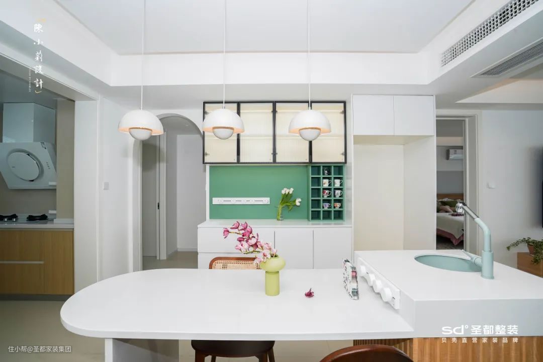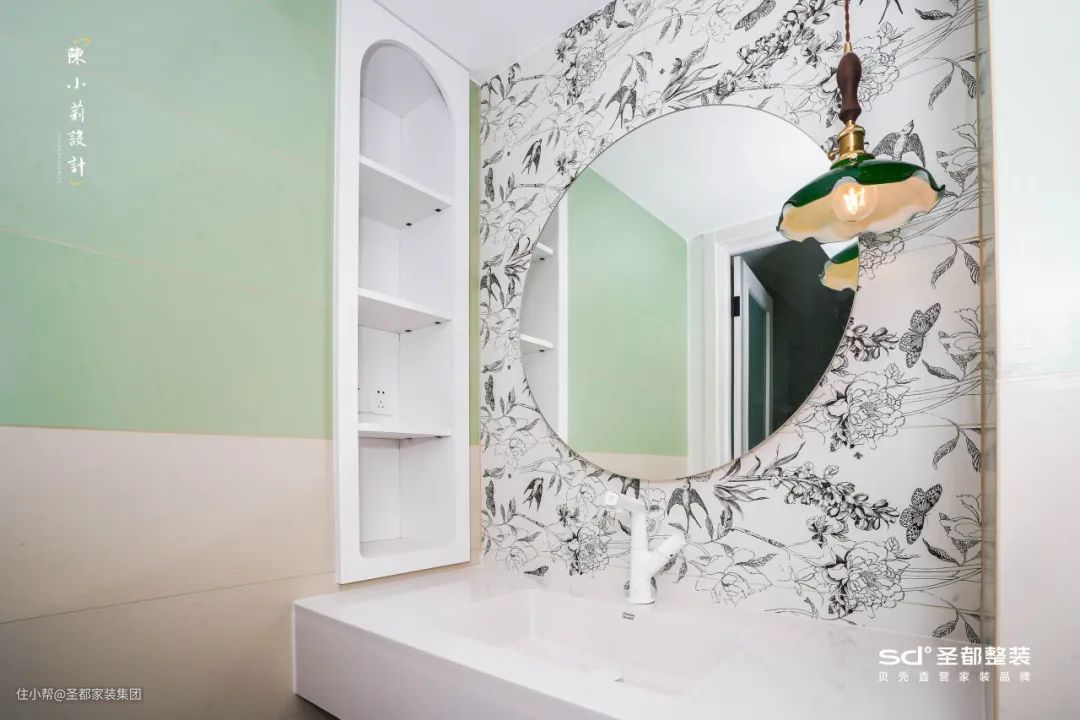 《莫奈的花园》里的床头背景墙跃入了一抹绿色的拱形拼色墙面,是空间里亮眼的点缀,迸发出鲜活又柔软的空间气息。