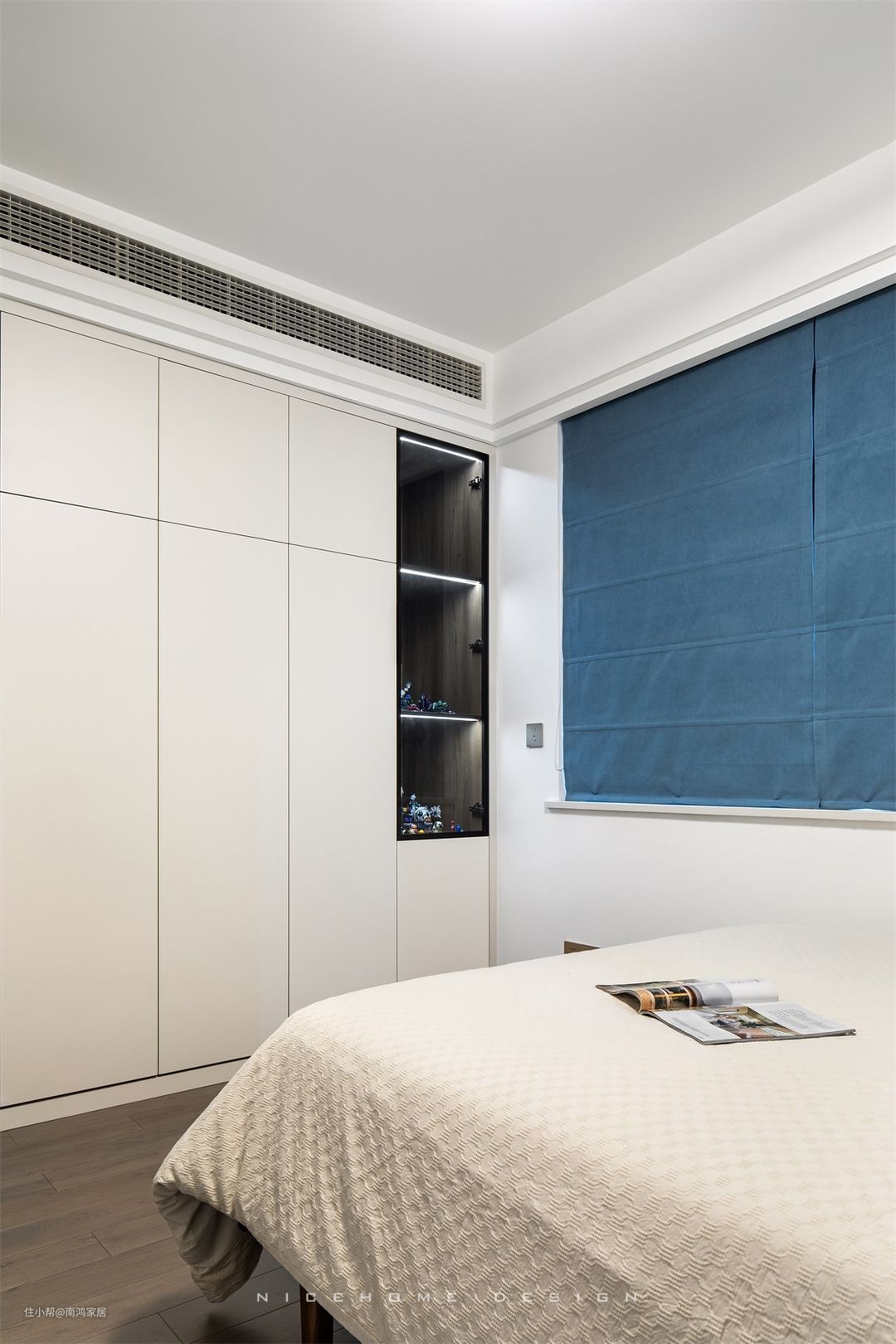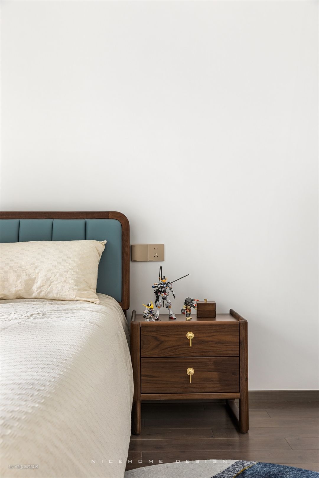 儿卧专为业主儿子设计,以干净实用为主。简约中式实木床和床头柜延续新中式语境,大白墙和米灰色定制衣柜为孩子的想象力预留更多空间。