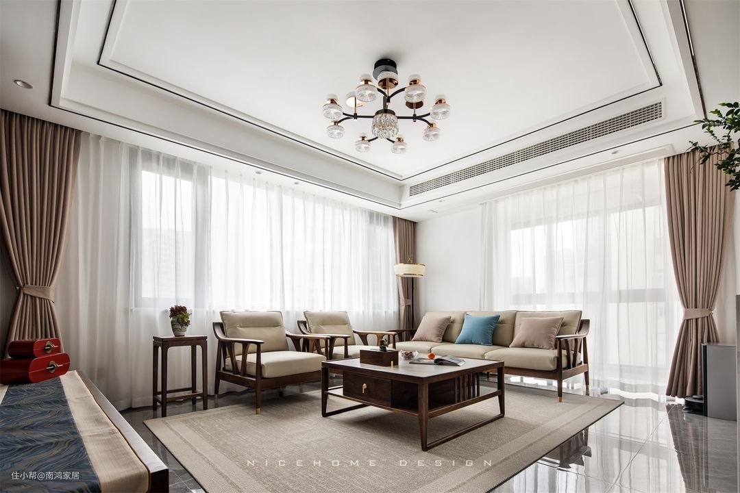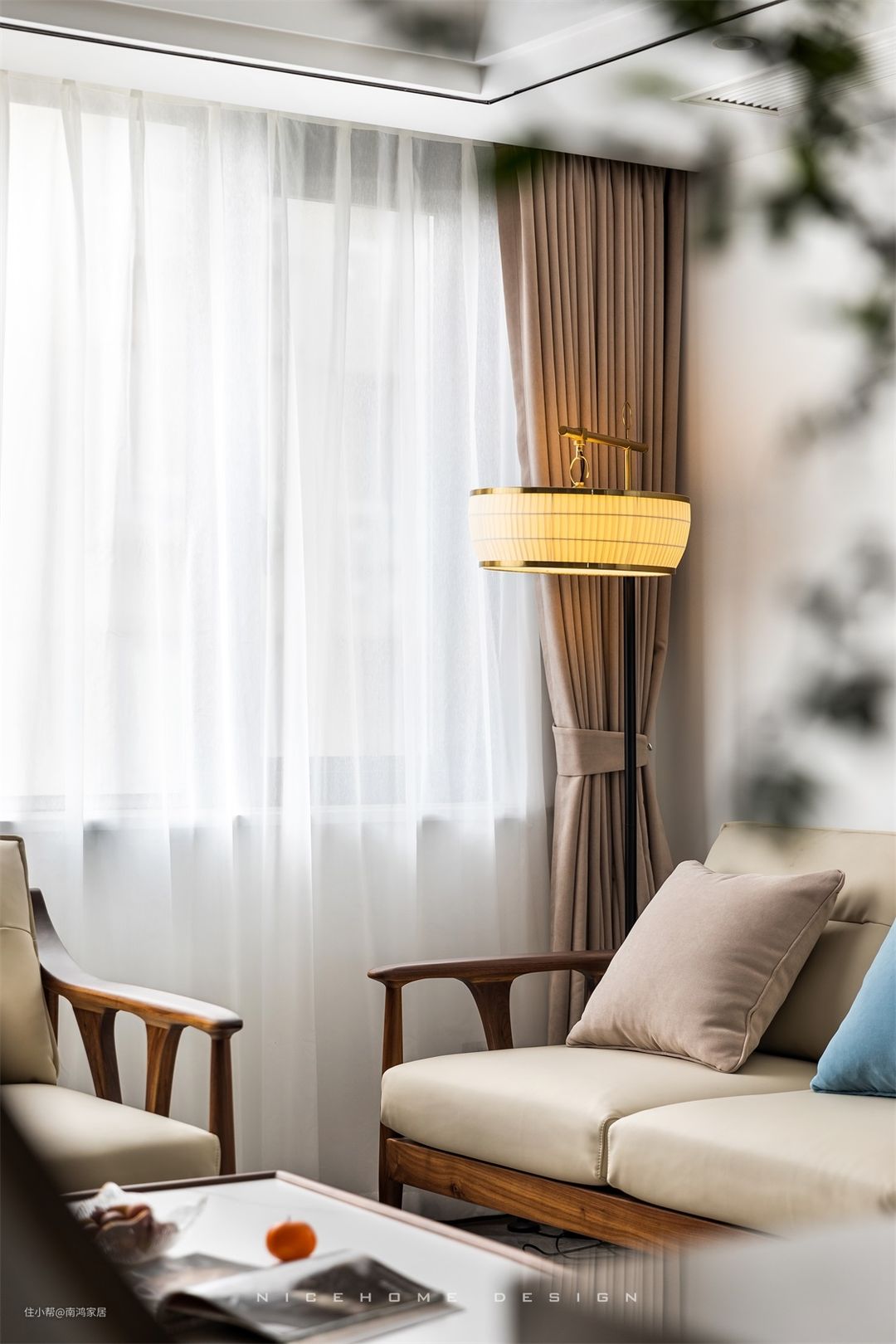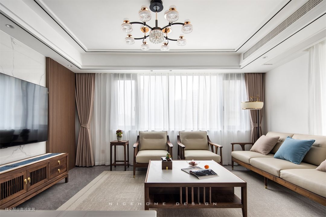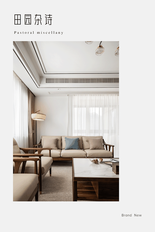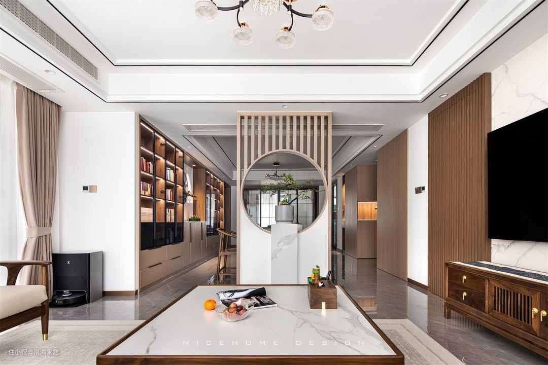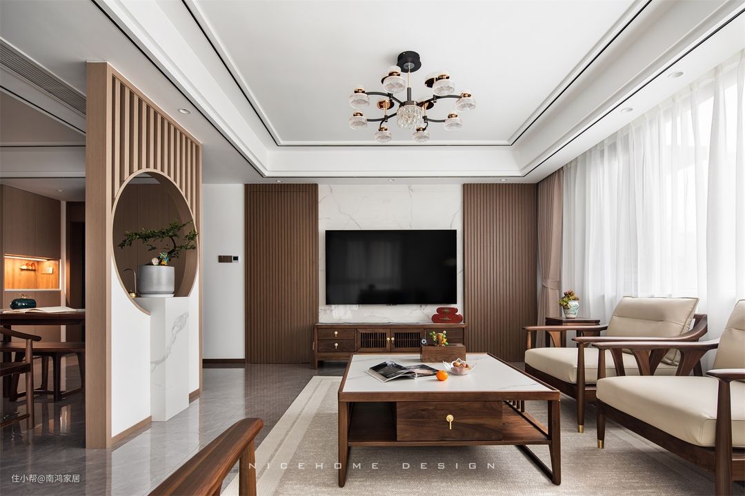 入户花架半遮半掩间围合方正格局,新中式直排沙发搭配同款单人沙发椅,以中式笔墨叙述日常故事。