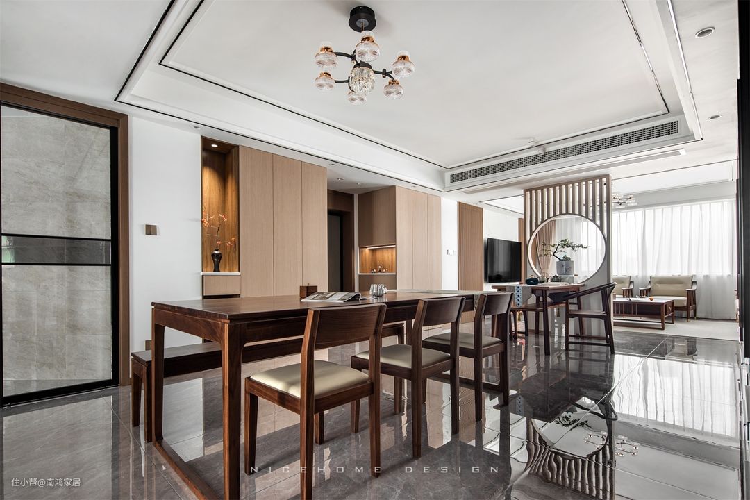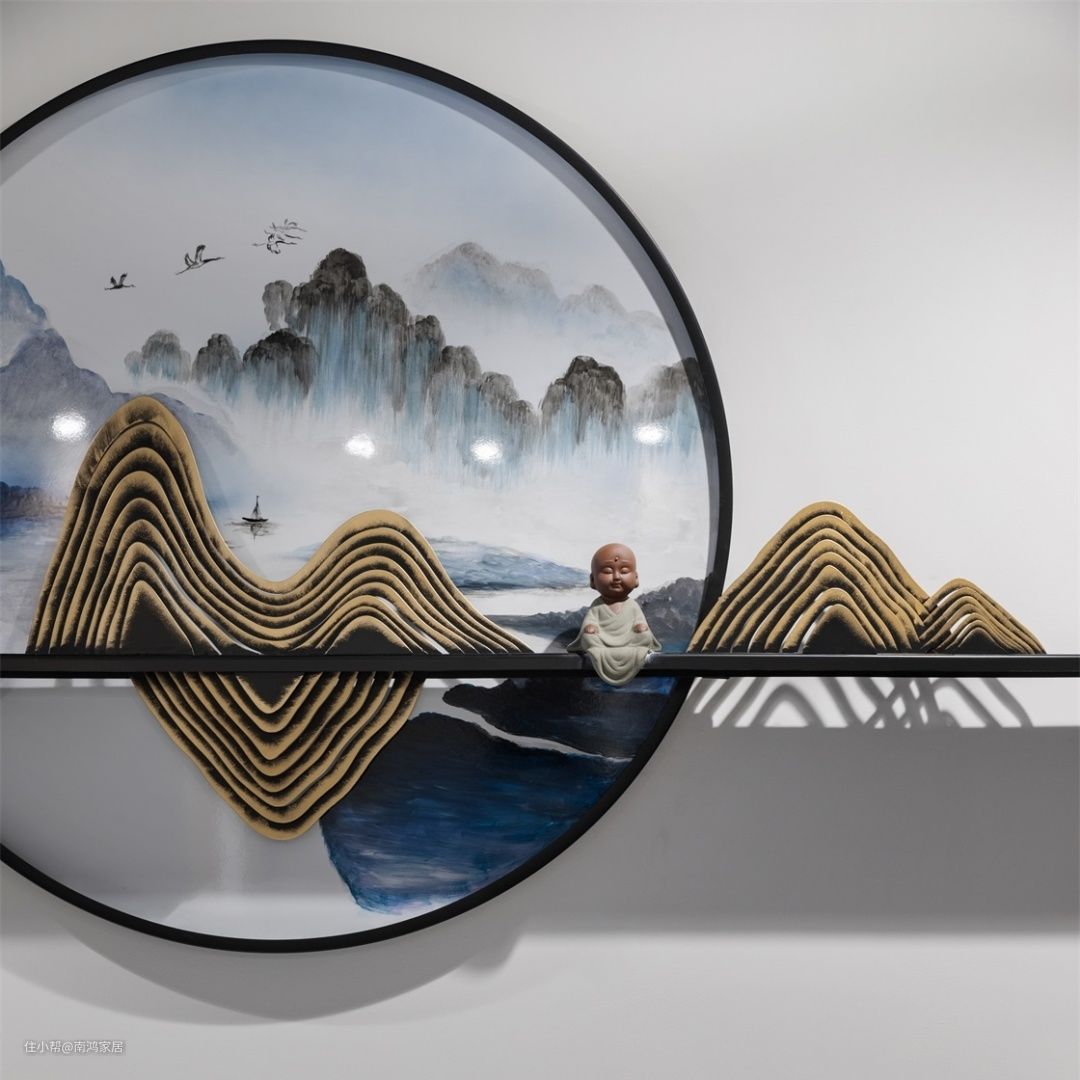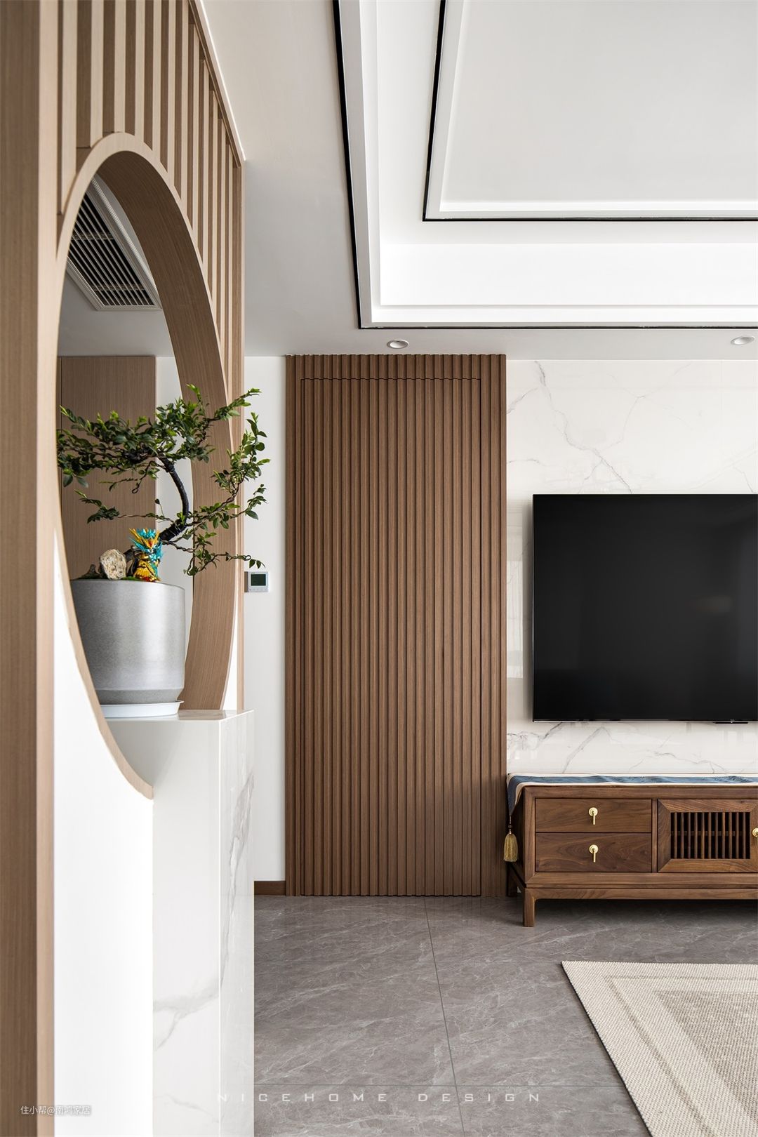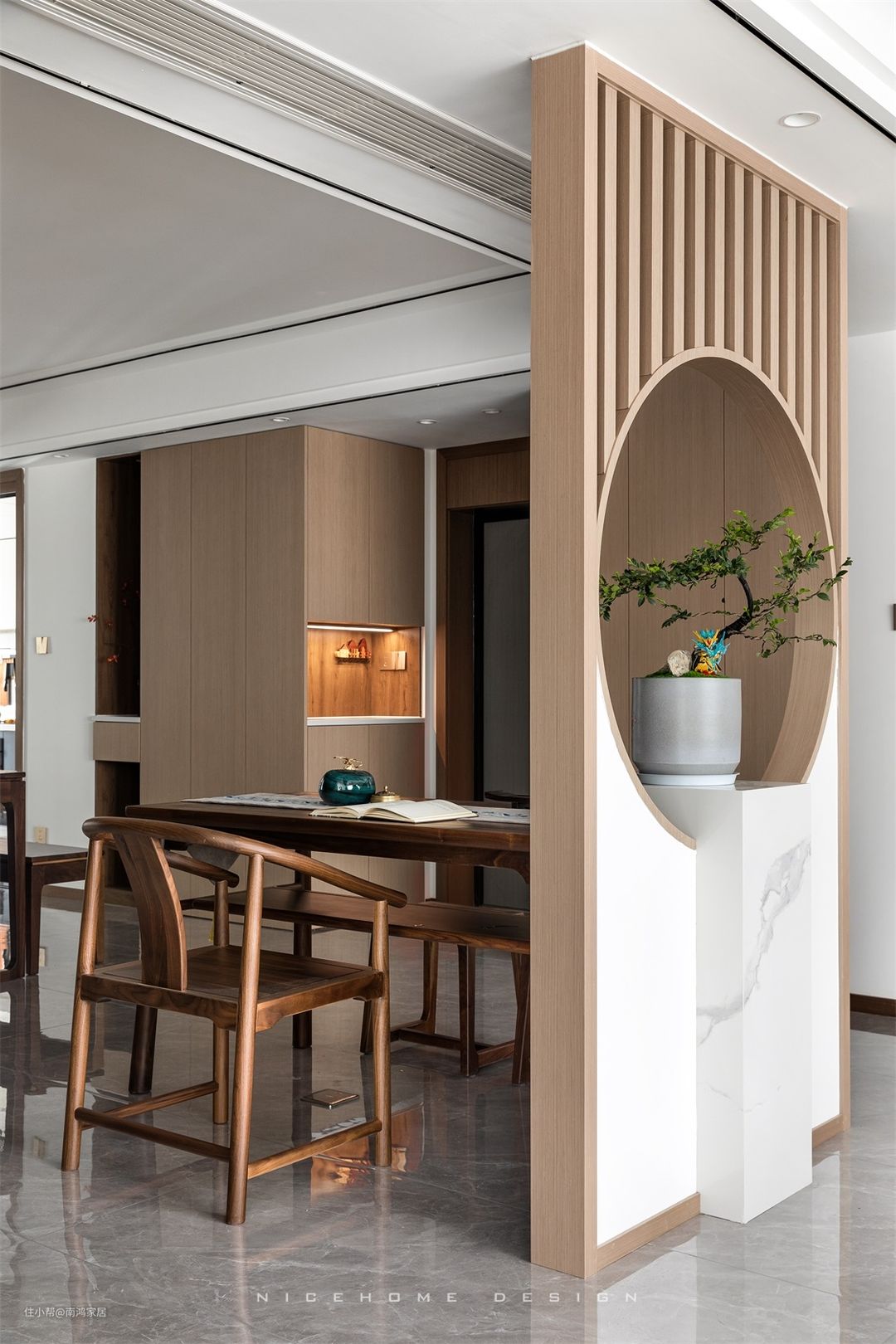 设计师根据夫妻双方的喜好和审美意趣,决定以新中式定调,将生活细碎隐没于浓淡有致的天然石材中、消泯于精细勾勒的实木家具中,并在适当留白中渲染成一首恬静淡然的田园诗~