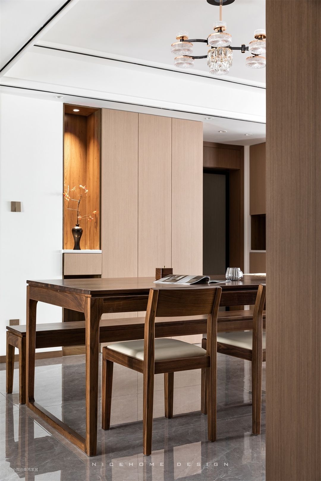 新中式实木餐桌和新中式实木餐椅均采用纯实木制成,丰富细腻的自然纹理展现天然材质特有的敦厚朴质。