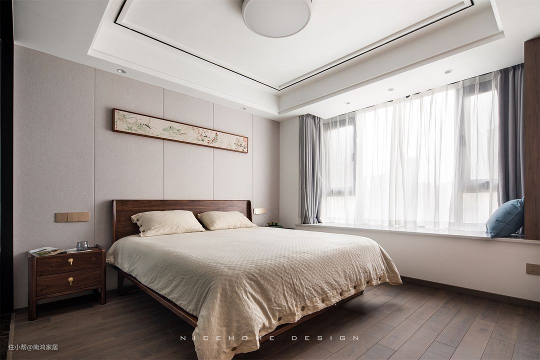 浅色墙包和胡桃色木地板搭建温润雅致的主卧,极简风双人床和中式简约床头柜隐没个性,任凭恬静与舒心自然舒展。