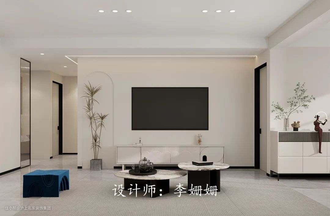 一大一小两个圆形茶居中置放,台面摆放精致的摆件,流露不俗的审美品质。蓝色的椅子以亮丽的色彩点缀了单一沉闷的空间。电视背景墙不做任何修饰,白色落地电视柜展现流畅简约的线条美,角落的落地绿植为单调的空间注入生机与活力。
