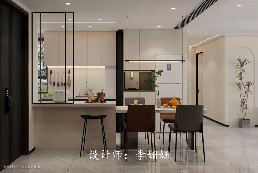 餐厨一体化设计,开放式布局使日常的生活动线更加灵活自然,让生活更具可能性。吧台设计兼具休闲娱乐与隔断功能,金属边框更显低调奢华质感。黑白色彩的组合搭配营造了时尚简约的氛围。