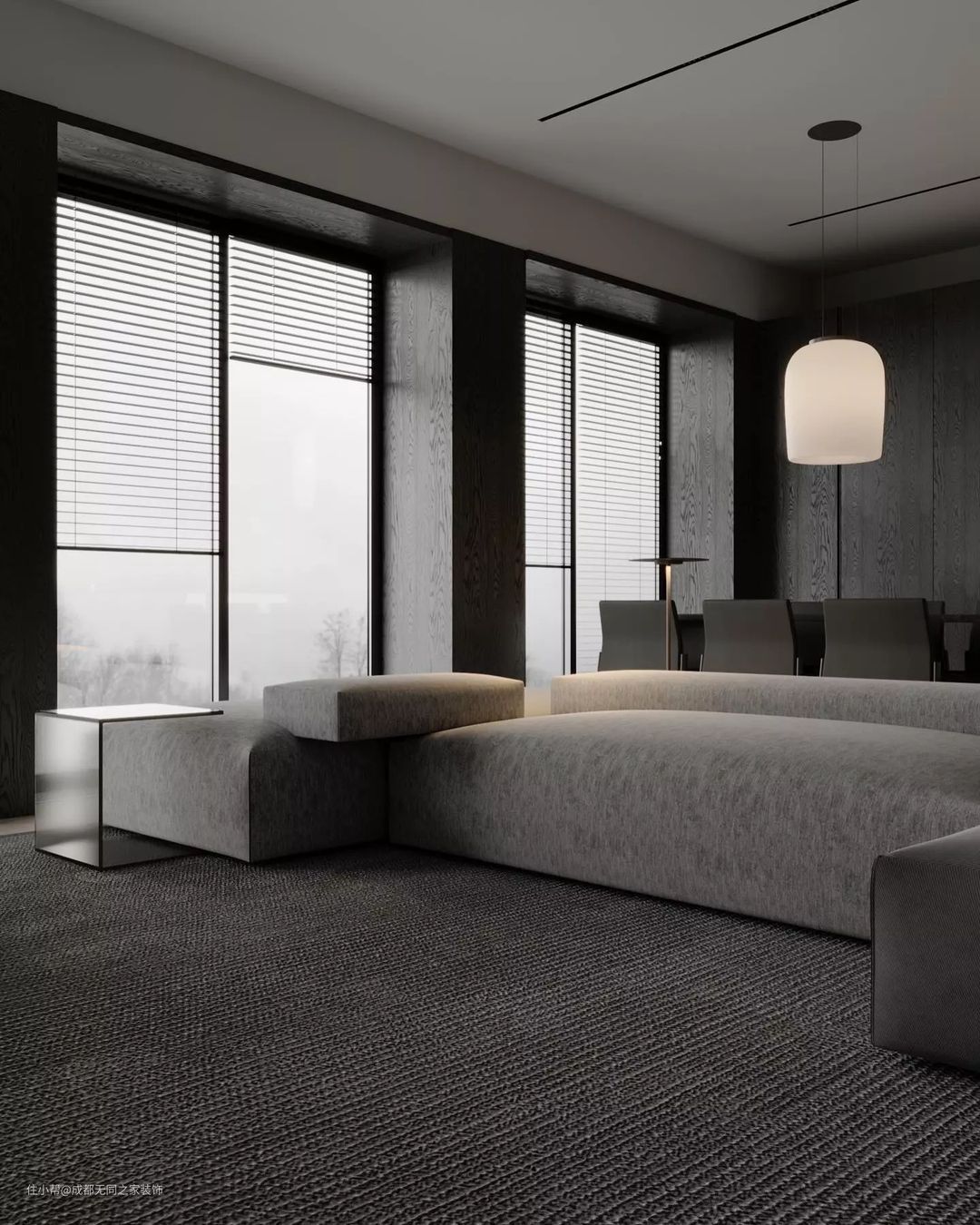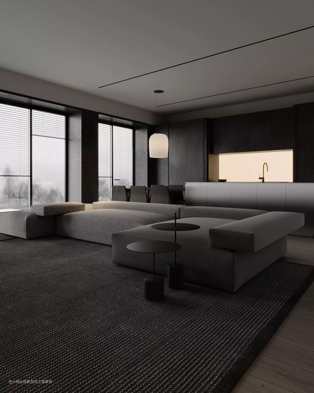 以极简风格为主,黑白灰经典配色,展现纯粹干净的装修风格。软装设计注重线条柔和和舒适感,创造出简雅而高级的空间氛围。