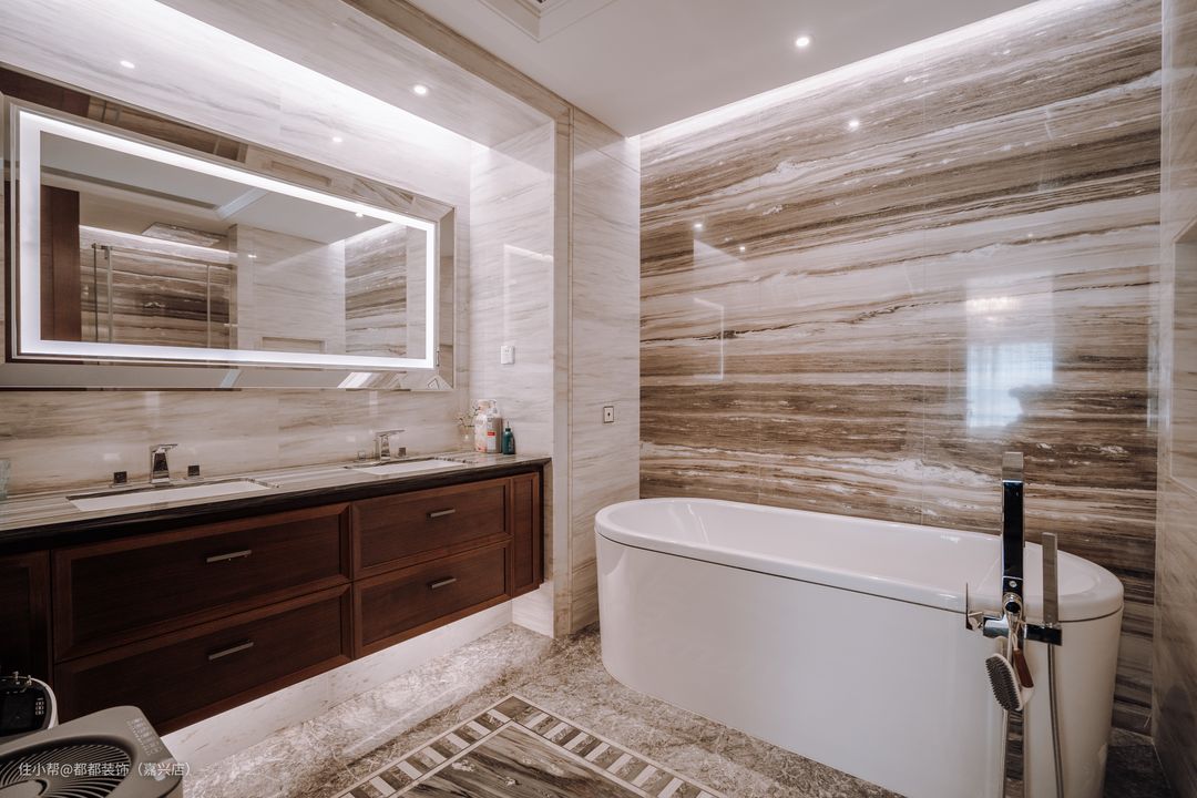 大理石本身具有耐磨,纹理细腻的优点,花色也有了很大的选择空间,可以极力的雕刻出现代质感中的轻奢感和高级感,大面积的大理石给人带来的感觉是强烈的,有一种开合自如的稳重奢华感。