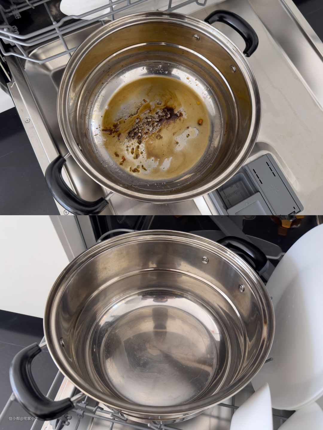 区域专洗模式水流强劲,卫星喷臂喷淋无死角,清洁指数超一级线!锅底干掉的重度油污轻松被清理,看,这种手洗非常磨人的污渍,洗碗机清洗起来就无压力了。
