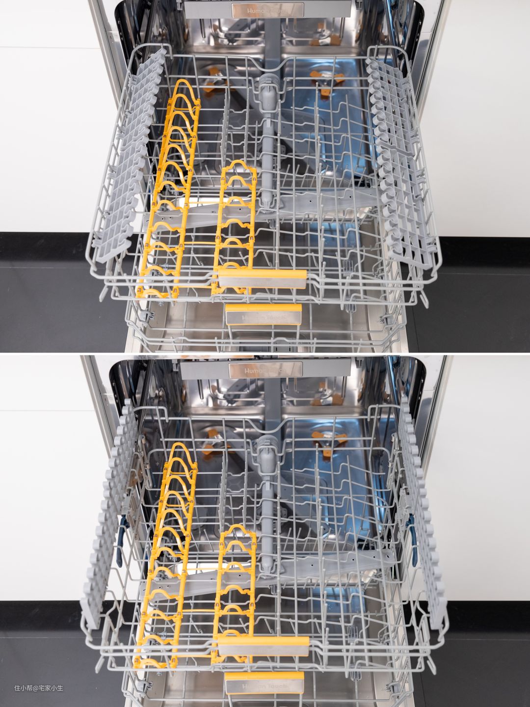 仅仅是大套数的话,普通的基础洗碗机也能做到16套,有的甚至去到了18套了,高配洗碗机有什么空间上的优势呢?总结来说,使用起来更加方便顺手了。