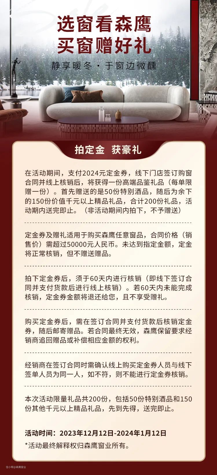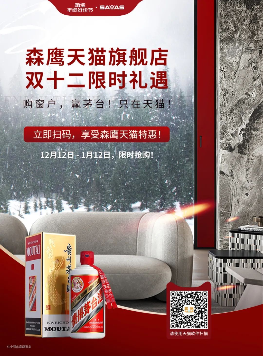 作为对您长期以来支持的感谢,我们在双十二期间推出特别活动:“选窗看森鹰·买窗赠茅台丨静享暖冬·于窗边微醺”。活动期间内,凡参与活动的客户都有机会获得一瓶珍贵的53°飞天茅台酒。想象一下,在寒冷的冬日里,坐在森鹰的窗前,品着茅台,是多么惬意的事情!此外,我们还准备了另外150份价值千元以上的精品礼品,让您感受到森鹰的诚意和感谢。