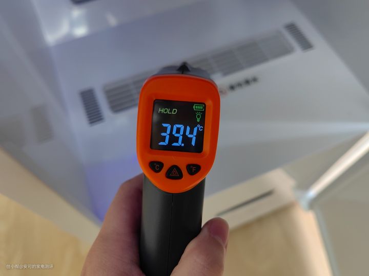 迅速打开衣柜即刻测温大概是39.4度的样子,温控做得比普通的烘干机更好,对衣物的呵护效果更佳,即使是像丝绸等的珍贵面料也可以放心拿进去烘哈