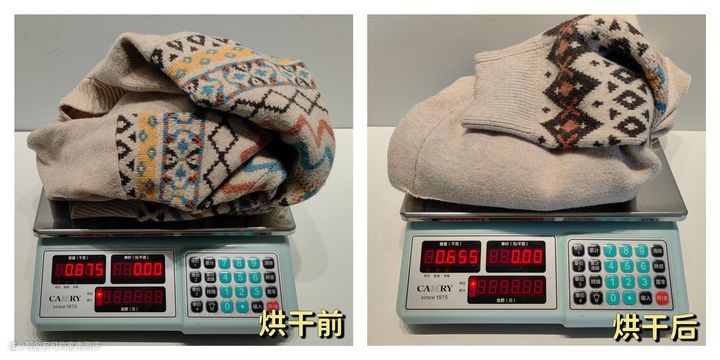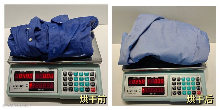 测量后看看2款衬衫烘干后的褶皱情况,我们发现每一件衬衫基本上都没有什么褶皱,虽然比不上熨烫后的效果,但完全是可以直接穿出门的(这点真的是我老公的最爱,我也没什么时间帮他熨烫衣服,所以他的衬衣经常都是皱巴巴的,有这个干衣柜,直接拿出来就能穿,其实也已经很平整了) 我们对衣物烘干前后进行了称重,一起来看看它烘干之后的重量吧,衣服烘得还是很干的 回头我再用水分测试仪给大家测一下